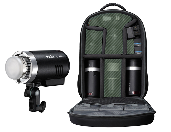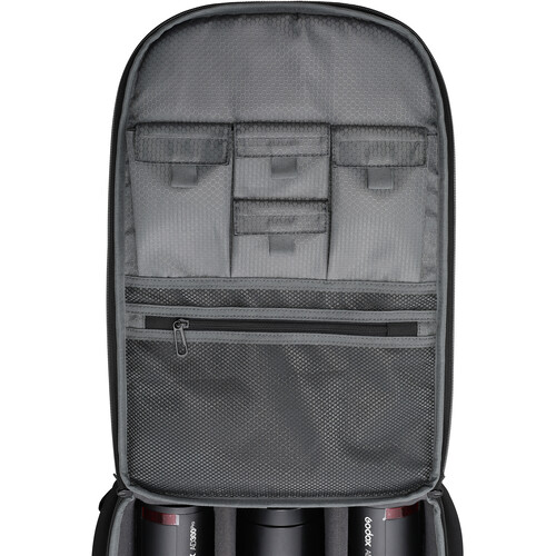 This CB20 Backpack from Godox holds two AD200, AD200Pro, AD300Pro, or AD400Pro strobe units complete with batteries, chargers, wireless remotes, and compact umbrellas for a fully portable lighting setup. Even when fully packed with the lights and accessories, the CB20 still has room to add a camera with lenses and a spacious lined pocket holds a 15" laptop or tablet.