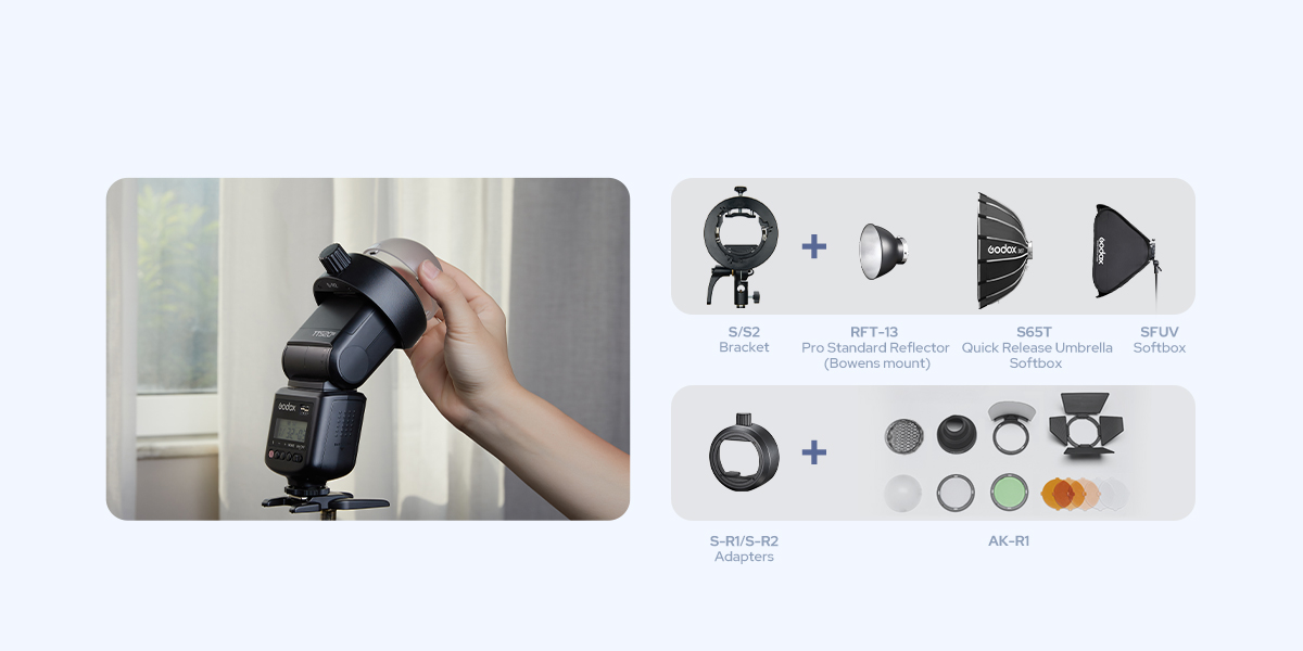 When paired with optional S-R1/S-R2 round head adapters, the TT520III works seamlessly with Godox AK-R1 magnetic accessories.