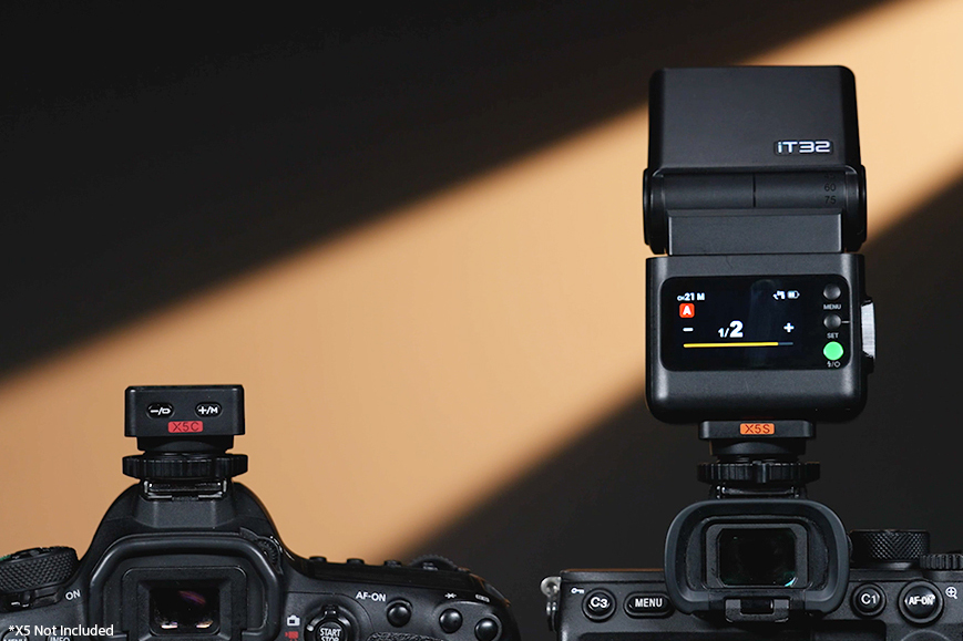 By simply aligning the separately available X5 with the bottom of the iT32, the flash will automatically absorb it for easy attachment. After this step, you can rotate the locking ring of the flash trigger to properly insert the optional X5 into the hot shoe mount of your camera, then rotate the locking ring until it's locked for secure attachment. The magnetic interface between iT32 and the optional X5 ensures a safe, one-click connection. When attached to iT32, the optional X5 functions as the hot shoe for on-camera shooting. If detached, it automatically switches to trigger mode for wireless control of the iT32.