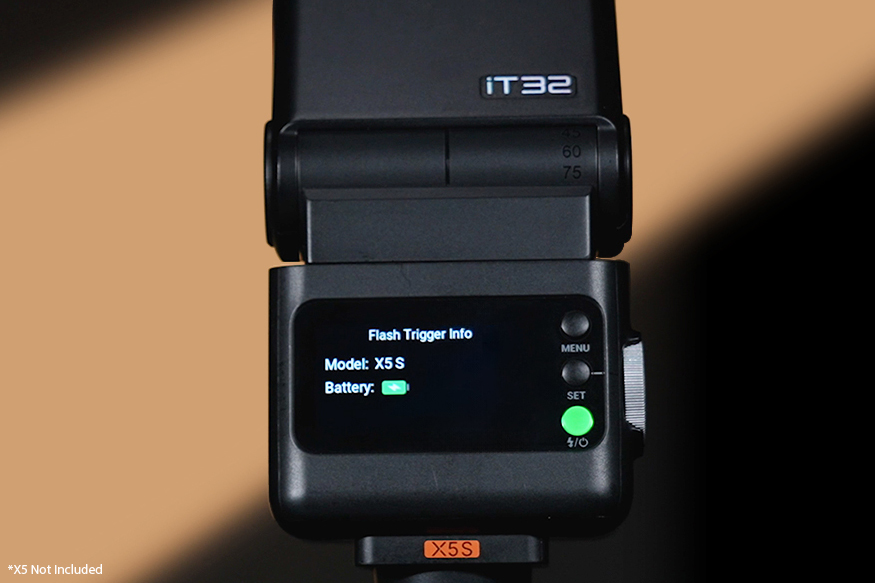 Remove the separately available X5 from the iT32 body and connect it to your camera's hot shoe mount to achieve wireless control of select settings from a maximum range of 65.6'. When the iT32 and the optional X5 are used together (iT32+X5 setting), they are capable of sync triggering other Godox flashes to increase flexibility and creative control. In this case, the maximum control distance is from 262.4'. Together, the iT32 and the optional X5 act as a master unit to trigger multiple Godox flashes simultaneously. Separated, the optional X5 can still control the iT32 and other flashes of the Godox X wireless system.