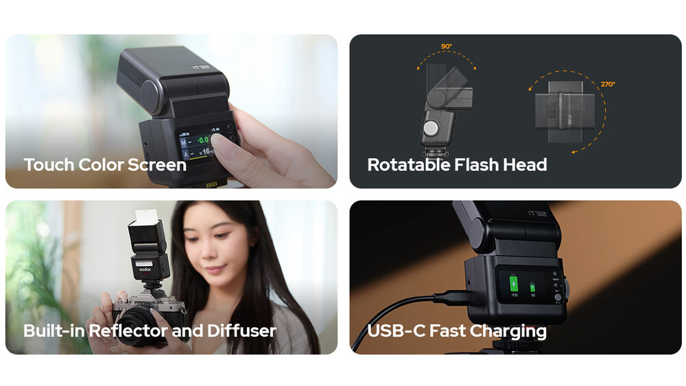 Offering auto TTL, Manual, Stroboscopic flash compatibility, and Godox's 2.4 GHz X wireless system, the iT32 TTL Mini Flash enables diverse lighting setups when paired with a separately available X5-series unit. Users can choose or switch between the X5C, X5N, X5F, X5O, or X5S to respectively find compatibility with a wide range of Canon, Nikon, FUJIFILM, Olympus/Panasonic, or Sony cameras; which means you can use a single iT32 flash body and opt for different hot shoes with wireless flash trigger capability. A compact and versatile lighting tool, this flash features an adjustable power range from 1/128 to 1/1 with fine-tuning options, 1.5 sec recycling, HSS support, a color touchscreen, and a convenient LED modeling lamp. The iT32 operates using a built-in USB-C rechargeable battery to provide up to 510 full-power flashes and still has a lightweight individual body at just 6 oz.