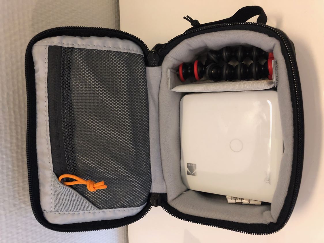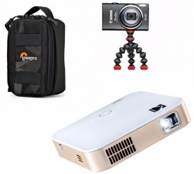 Kit with a Kodak Luma 150 video projector, a transport and storage case (Lowepro Viewpoint CS40) and tripod for holding and angling the projector (JOBY Gorillapod Magnetic Mini).