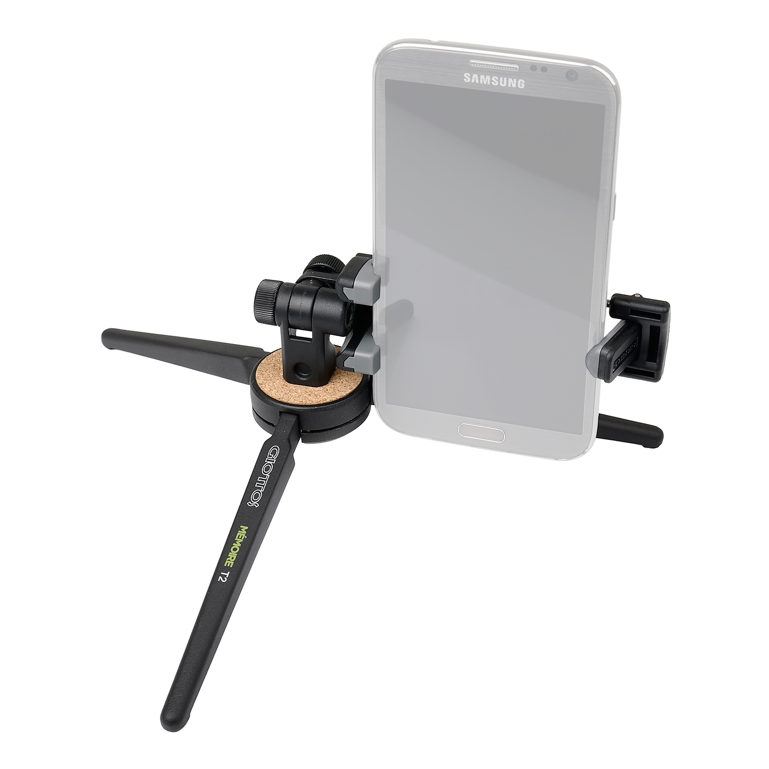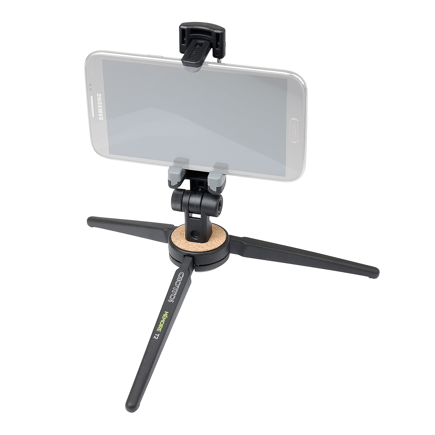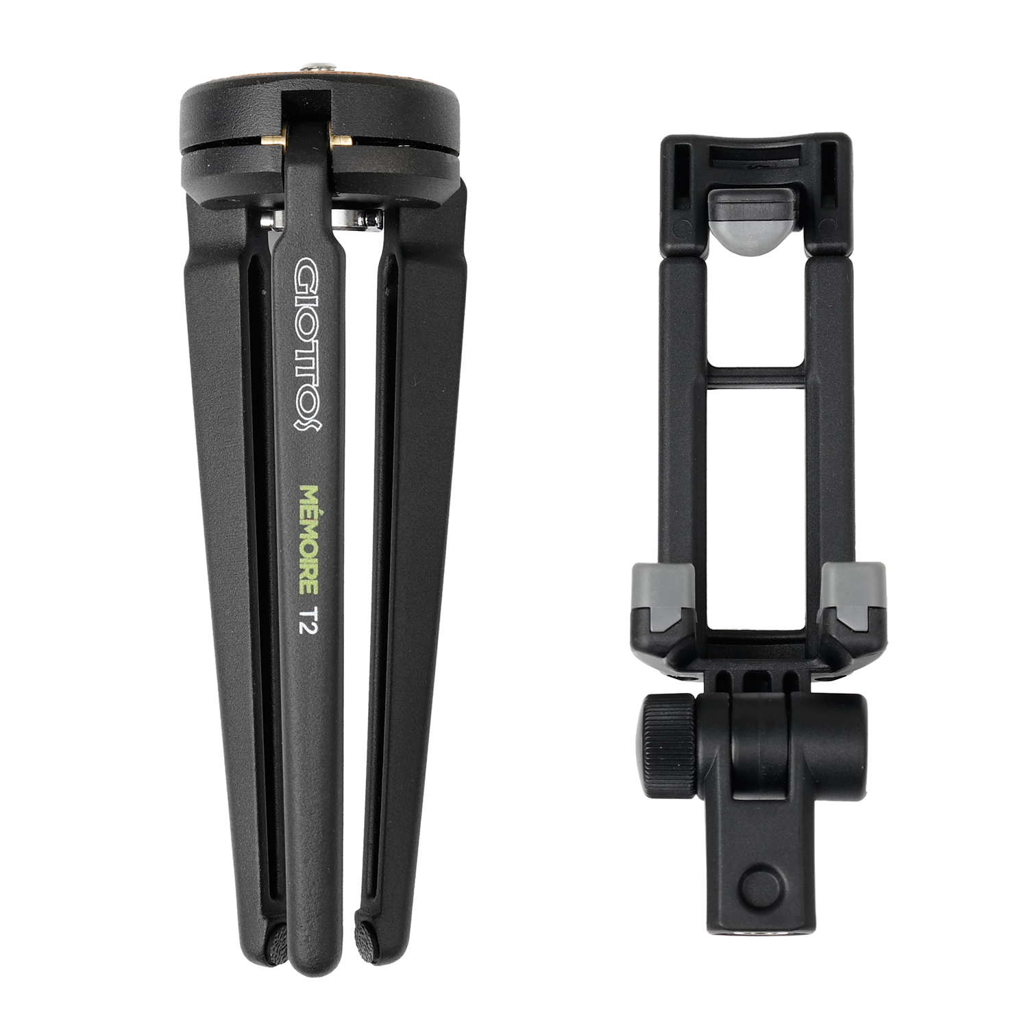 Giottos Mémoire T2 Mini Tripod with Phone Holder The Giottos Mémoire T2 is a very handy and robust mini tripod with a phone holder. The phone holder is suitable for smartphones up to eight centimeters wide. By loosening a screw on the back of the phone holder, it can be used both horizontally and vertically. Removing the phone holder exposes a standard 1/4" thread, allowing you to mount any camera with a tripod mount. The T2 table tripod has a maximum height of 5.6 centimeters and a maximum load capacity of five kilograms.