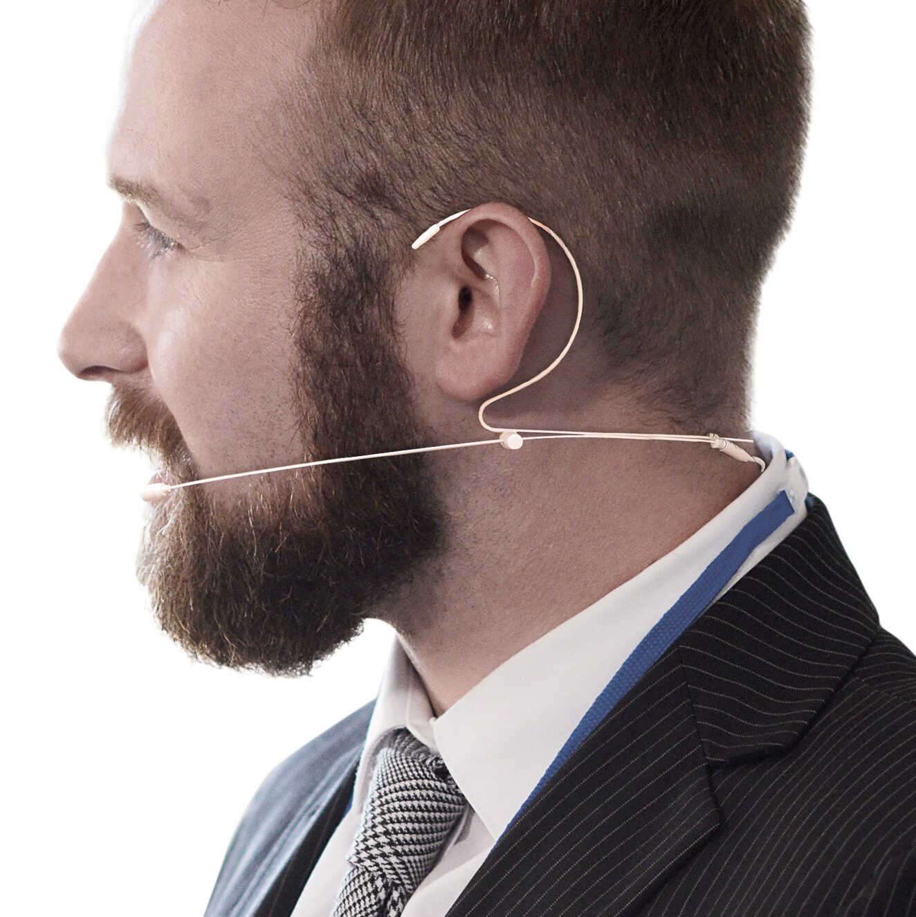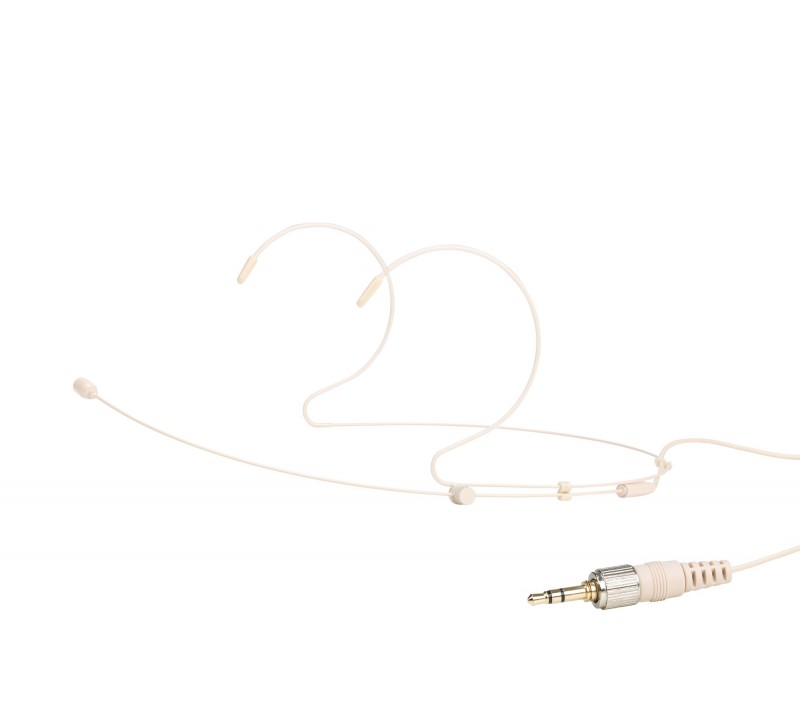 with hypoallergenic ear straps for maximum flexibility and comfort during work. Adjustable with a knob to fit any type of face. The microphone, which is coated with a durable pink varnish, perfectly adapts to the color of the skin to ensure the lowest possible visibility among professional video cameras.