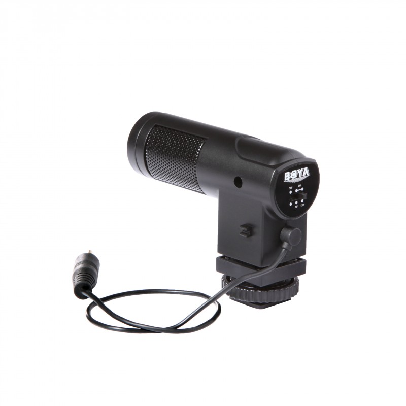 The BOYA BY-V01 is a stereo X / Y CONDENSER microphone, this microphone provides Greater control of your audio than the internal MICS on DSLR camera, video camera, or digital recorders. A switch for 90 ° or 120 ° pickup patterns Allows you to adjust the directivity of the microphone. Compact and lightweight, the BY-V01 Attach to your camera's shoe mount and Directly plugs into your camera or portable recorder's microphone input for crisp, clear stereo audio capture. The included windscreen cuts down not only on environmental noise, but on the operational noises of the camera and lens, Such as autofocus movement.