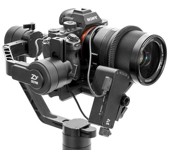 Motorized Follow Focus unit for Zhiyun Crane 2, compatible with all DSLR and mirrorless system cameras from Canon, Nikon, Sony and Panasonic.