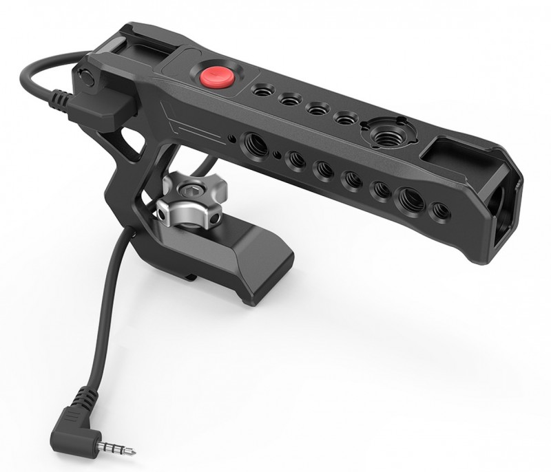 SmallRig NATO Top Handle with Record Start/Stop Remote Trigger for Panasonic Mirrorless Cameras 2880 is designed to provide a comfortable grip and features record button on top to control camera start/stop. The handle attaches to the camera cage via standard NATO rail and secures via the thumbscrew. Featuring multiple 1/4"-20, 3/8" -16 and ARRI 3/8" -16 threads for accessories such as Monitor Mount 2348. Integrates with three cold shoe mounts, with one of which is designed with an anti-slip button allows mounting mic, light, as well as Monitor Mount 2346. The start/stop trigger button is located where the thumb rests. The includes cable is Panasonic remote to the type C standard, the front of the handle features a slot for cable tethering. Compatibility with an array of cameras that use the Panasonic remote protocol, such as the Panasonic GH5/5S, G9/G95, and S5/S1/S1R/S1H. Optional Multi-Camera Control Cable 2971 is sold separately if you want to control your Sony multi-terminal cameras.