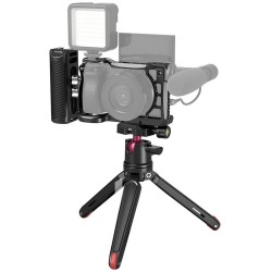 The lightweight aluminum cage provides numerous 1/4"-20 and 3/8"-16 accessory mounting threads, and it doesn't obstruct your camera's ports, battery, or screen. The cage mounts onto the compact tabletop tripod featuring a ball head that can tilt up to 90° and pan 360°. The nonslip side handle mounts onto the left or right side of the cage using 1/4"-20 screws, and it can slide up or down up to 1.7" for the best position.