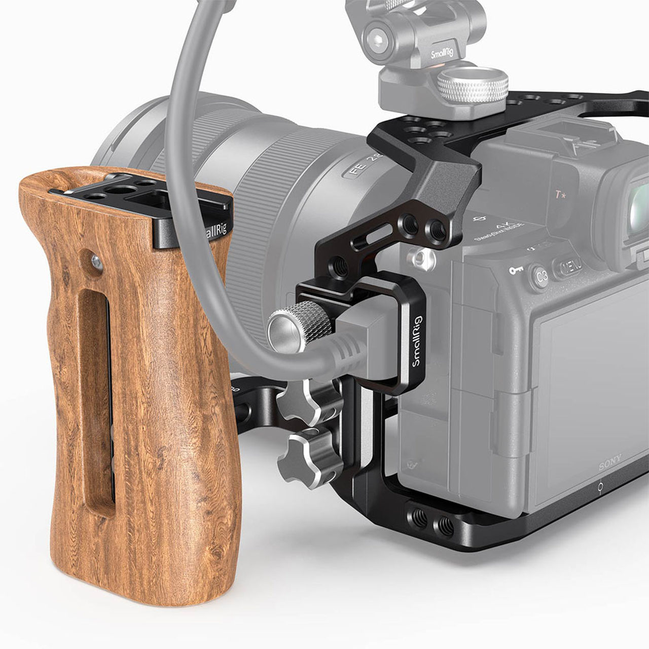 The SmallRig 3008 Professional Kit for Sony Alpha 7S III A7S III A7S3 includes an aluminum full cage, an HDMI cable clamp, and a wooden side handle. The camera cage features 1/4"-20 and 3/8"-16 mounting threads, a NATO rail, a cold shoe mount, and ARRI-style mounts for accessories. The HDMI clamp attaches to the side of the cage using a 1/4"-20 screw and two anti-twist pins, which prevents the camera's HDMI cable from disconnecting. The smooth wooden handle can be used on the left or right to provides a solid, comfortable grip.