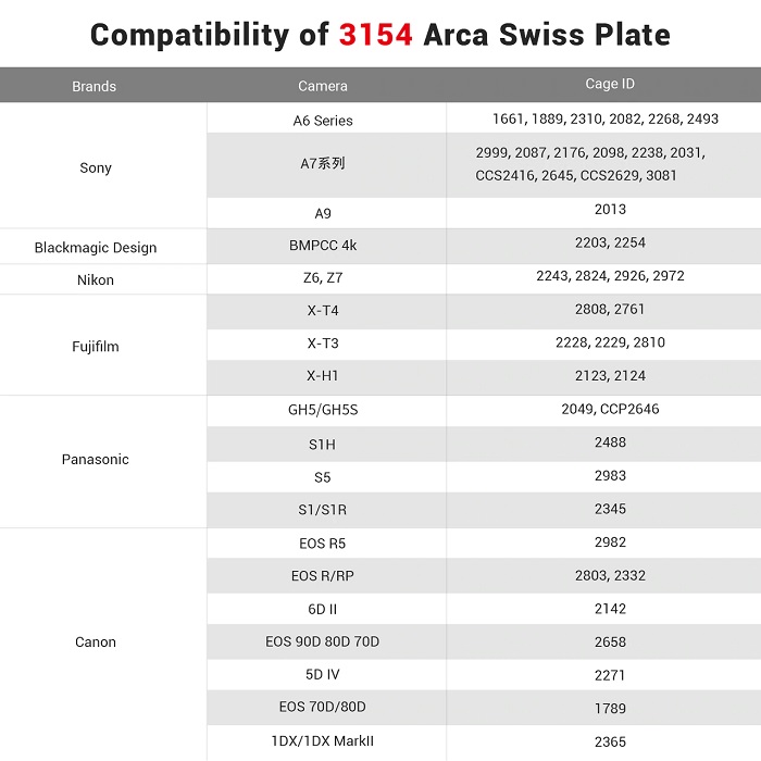 SmallRig Arca-Type Quick Release Plate for DJI RS 2 and RSC 2 Gimbal 3154 is designed to attach to camera cage with two 1/4”-20 screws to fit in RS 2 and RSC 2 Gimbals, and solve the twisting issue that the original Arca Plate only allows being attached onto the cage through one 1/4 screw. Compared with the original Arca plate, the plate 3154 is extended 10mm longer and increases the range for left and right adjustments to mount cameras in special shapes, such as BMPCC 4K camera equipped with a cage. The distance between the two locking 1/4 screws is 18mm which is compatible with most SmallRig cages like Sony A7S III cage 2999, Canon R5/R6 cage 2982, Nikon cage 2926 for Z series cameras, etc. Moreover, the plate features an open-middle design so you can access most camera mounting screw through the plate and easily unmount the camera from the cage to move it to a tripod or other mounts. The plate also features rubber pads to protect the cage.