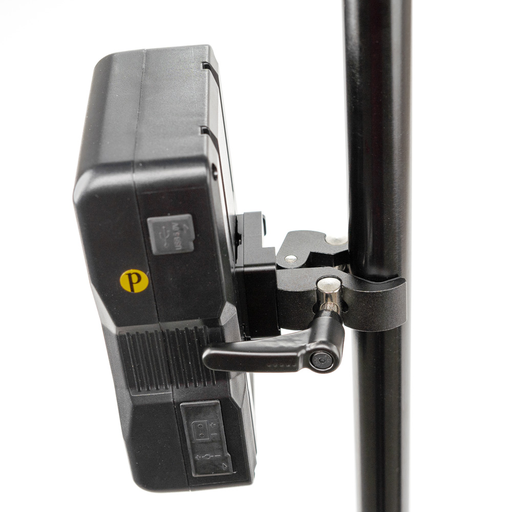 This V-Mount Battery Clamp from Caruba is a handy, compact accessory which secures to light stands, tripod legs and gimbals with ease. This allows you to attach a V-mount battery so you can power a nearby light, monitor, or other accessory. You would need a battery with a D-Tap output so you can run a compatible cable from the battery to your device. The clamp has a clamping diameter between 1,5cm and 4,5cm and is made of aluminum with textured rubber padding on the clamp jaws for safe, nonslip attachment.