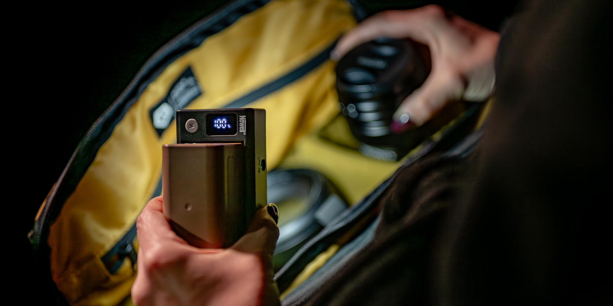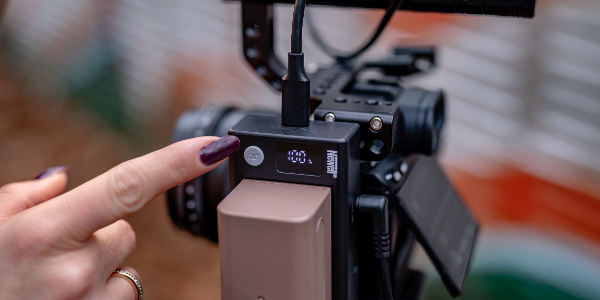 At the front of the Newell DC – USB adapter, you will find an LCD screen that displays the percentage charge level of your NP-F battery. This is a huge convenience when working in the field – you know immediately how long you can still power your equipment and when it is worth preparing another battery. The display consumes very little power, so it does not significantly affect the operating time of the set. The charge status information is always visible and legible, even in difficult lighting conditions.
