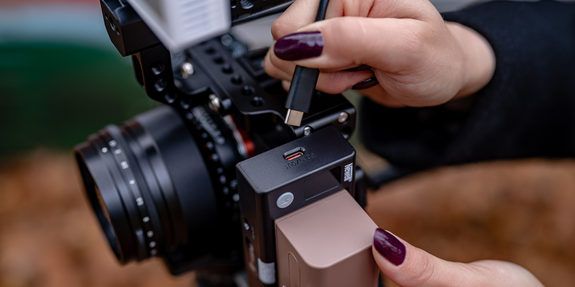 The Newell DC–USB adapter is equipped with a 1/4″ thread, which allows it to be mounted on almost any camera equipment – from a camera cage to a film rig to a tripod. The rubber finish improves stability, protects against scratches and prevents unwanted movement of the adapter. A special locking system ensures that the NP-F battery does not come out during dynamic movements. It is a design created for intensive work in various conditions.