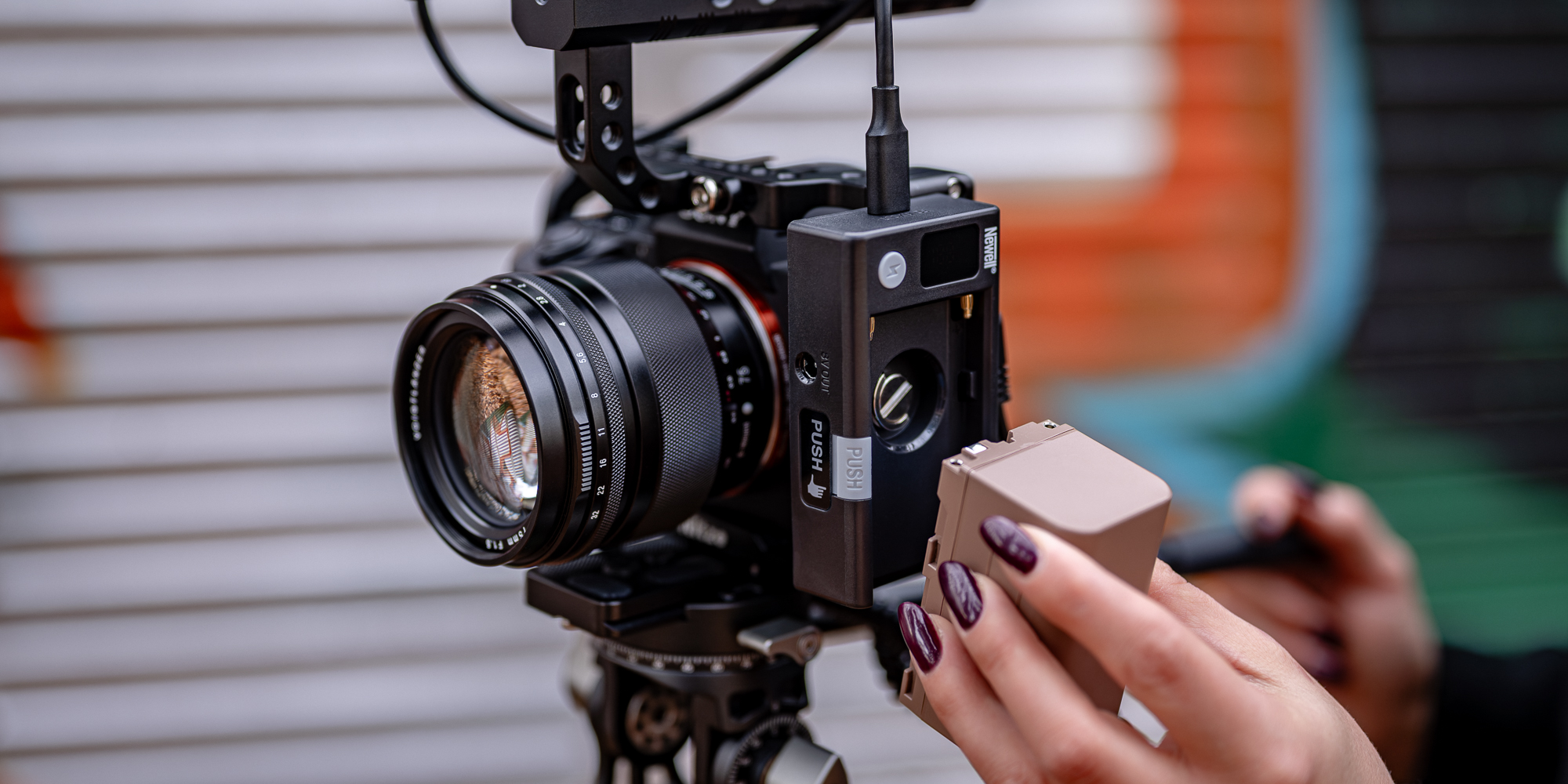 The Newell DC–USB adapter is equipped with a 1/4″ thread, which allows it to be mounted on almost any camera equipment – from a camera cage to a film rig to a tripod. The rubber finish improves stability, protects against scratches and prevents unwanted movement of the adapter. A special locking system ensures that the NP-F battery does not come out during dynamic movements. It is a design created for intensive work in various conditions.