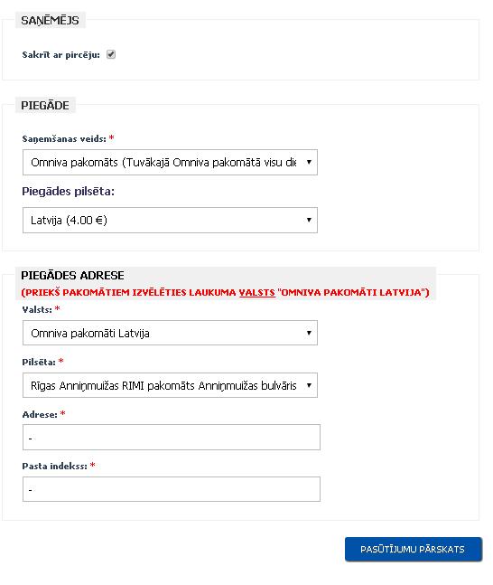 1. Выберите способ получения заказа — OMNIVA пакоматы (Автоматически система поставит Латвию)