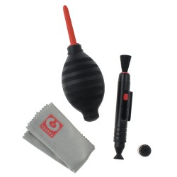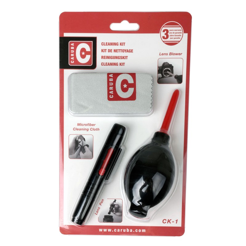 The Caruba Cleaning kit is an ideal tool to keep your equipment free of dust, grease and dirt. The lens pen features a handy brush on one side for removing dust and dirt. The other end contains a round pad with a mild cleaning fluid. The microfibre cleaning cloth can be used to remove fingerprints, dirt and other contaminants. The bellows can be used to remove dust from your sensor, lenses or other sensitive equipment with a soft blow of clean air.