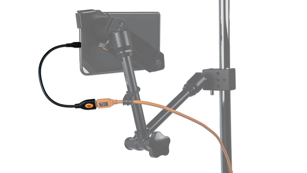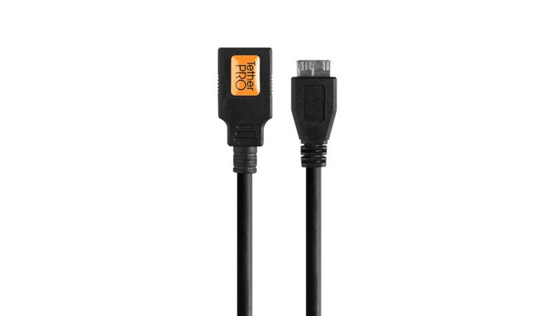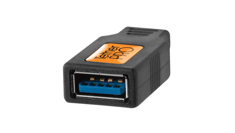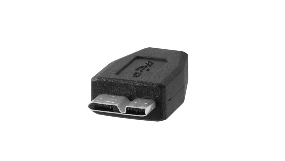 The adapter features a Micro-B USB 3.0 male plug on one end and USB type A female on the other and is 4.5 inches in length. For use in tethered photography, one would simply attach a compatible TetherPro USB Cable from the camera into the TetherPro USB 3.0 OTG Adapter. The Inline JerkStopper is recommended to keep the cable connection solid when working with a mounted tablet.