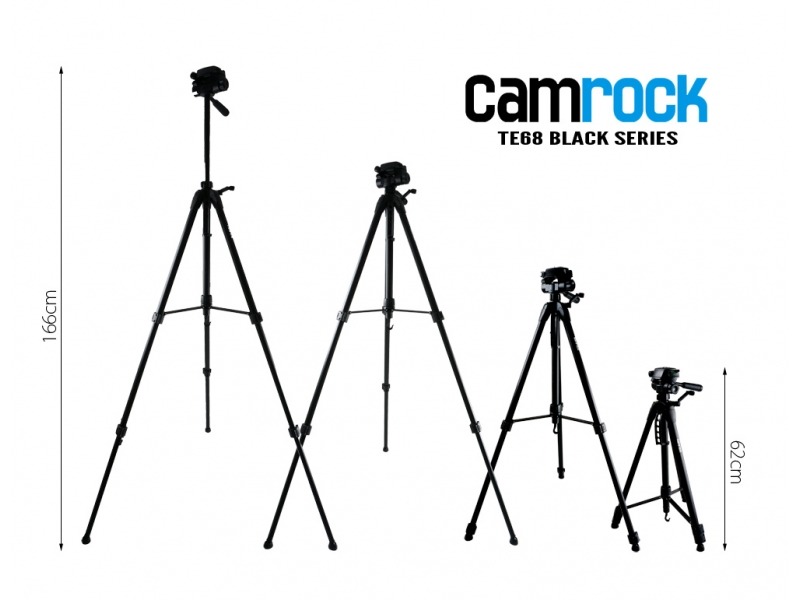 The Camrock TE68 is a very high, semi-professional aluminum tripod. Thick legs with a specially designed cross-section guarantee outstanding durability and sturdiness. It is made from aluminum and Strengthened. Perfect for DSLRs, weighty cameras and video cameras.