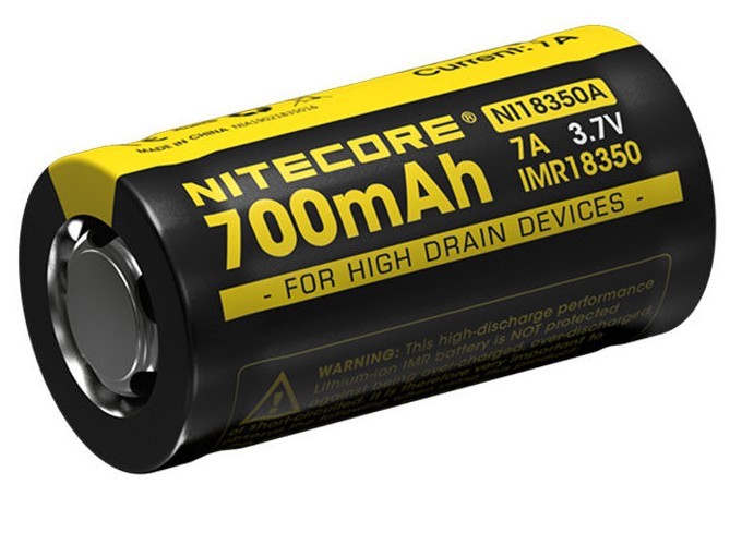 The Nitecore IMR18350 rechargeable battery has a capacity of 700mAh and a continuous pulse discharge current of 7A. This button top battery should only be charged in the special Nitecore chargers from the UM series or the Digicharger. This battery is ideal for the Nitecore EC11 LED torch.