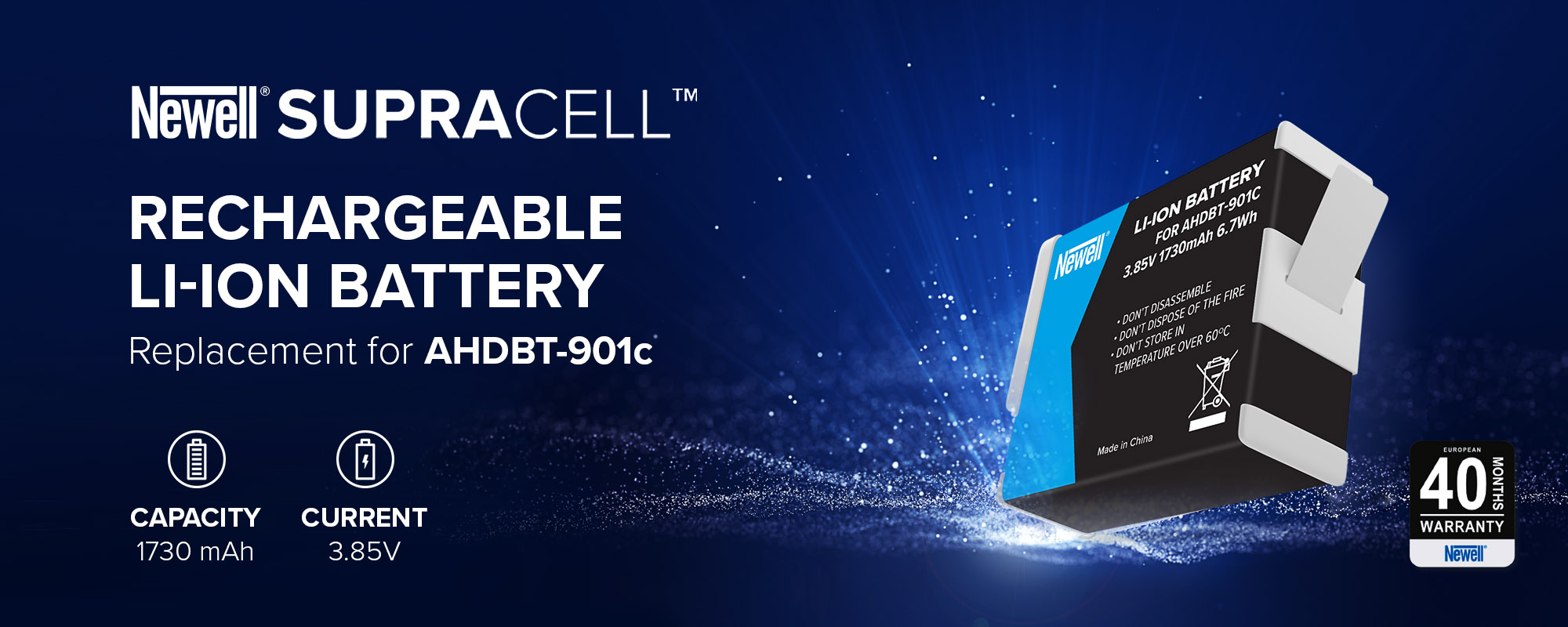 Newell SupraCell AHDBT-901c is an innovative battery replacement designed for sports cameras. The cells and modern electronics used in it will satisfy even the most demanding users. The SupraCell line was created specifically for intensive use, as well as very frequent charging and discharging. The presented cell offers 1730 mAh capacity. Thanks to its resistance to extreme temperatures, you will successfully use it when working on videos shot both in the winter landscape and during hot days. With a 40-month warranty, the revolutionary Newell SupraCell battery will accompany you for many years, and in case of any failure, it will be quickly replaced by the manufacturer with a new one!