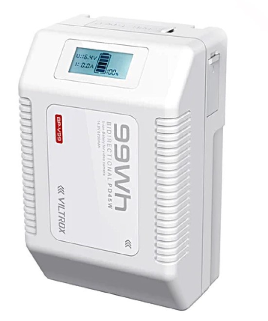 The Viltrox BP-V99 6700mAh V-Lock Lithium Battery has a capacity of 99Wh and is bi-directional PD45W. This makes it an excellent choice for supplying power to various electronic devices, such as mobile phones, laptops, cameras, etc.