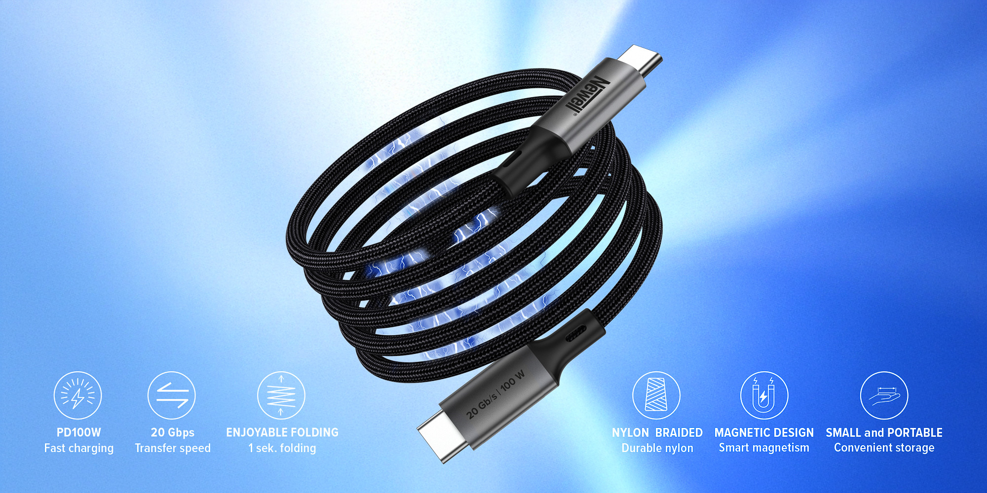 The Newell USB-C – USB-C 3.2 Gen 2 – 1 m magnetic cable is the perfect choice for those who travel frequently. Thanks to its ability to retract almost automatically, you don’t have to worry about chaos in your bag. The cable is always ready to use, neatly coiled and untangled. It is ideal for both storing in hand luggage and in the car, where it does not take up excess space.