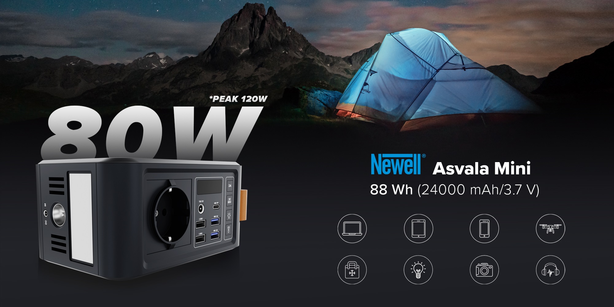When you choose the Newell Asvala Mini, you get a power bank with impressive capabilities. Thanks to its large battery capacity (24,000 mAh), you will easily charge devices such as smartphones, tablets, laptops, drones, cameras, e-book readers, camcorders, wireless headphones, watches, electronic cigarettes and many other devices. A traditional electrical outlet will also allow you to power up to 80 watts of consumer electronics (120 watts peak power). This one device is enough to effectively make you independent of the power sources you use every day at home or at work.