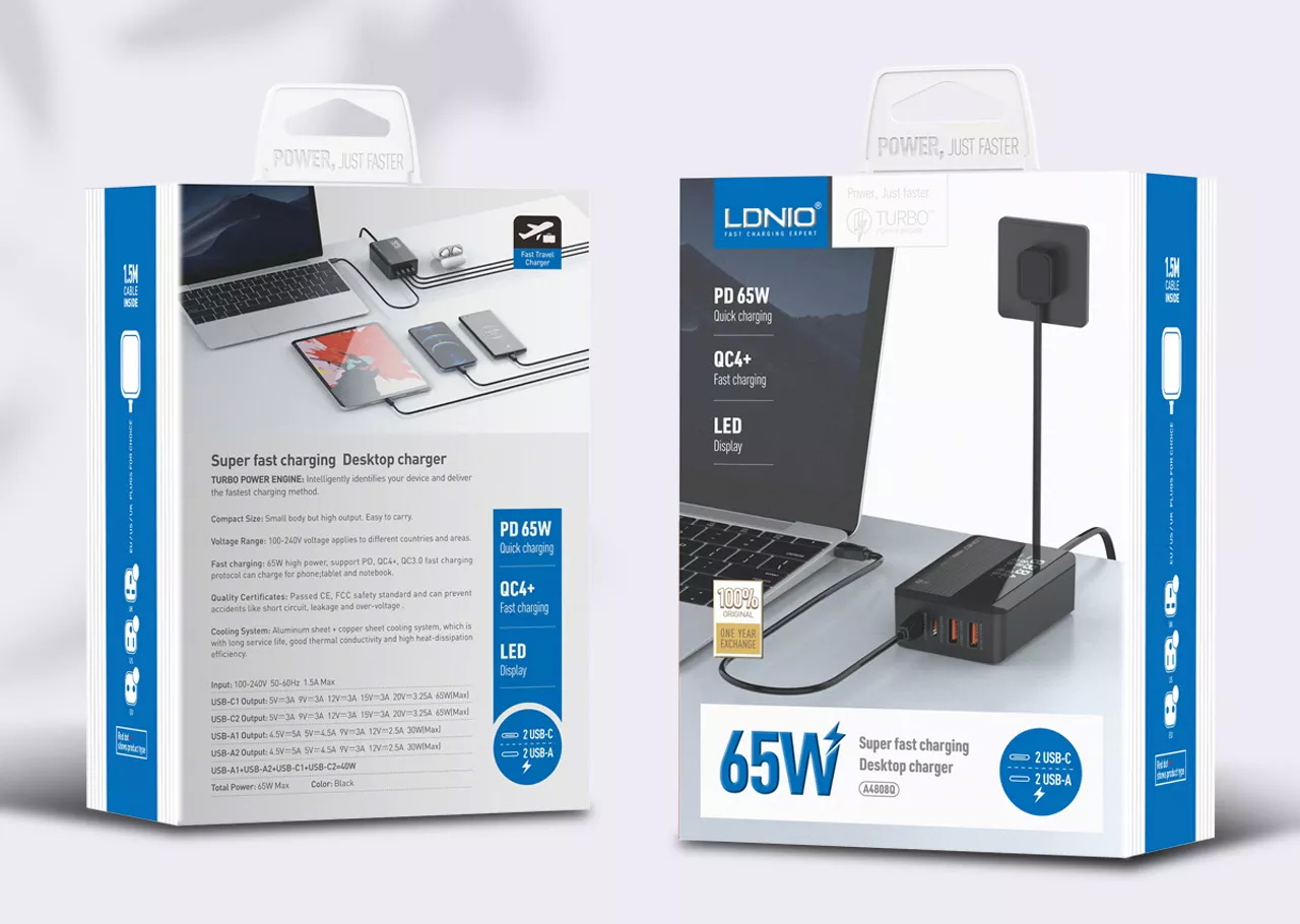 They will allow you to quickly and very importantly safely charge various mobile devices such as smartphones, tablets and smartwatches. The intelligent systems used will automatically detect the type of equipment connected, adapting the appropriate charging power to it. Thanks to the USB-C port equipped with Power Delivery technology, you will also quickly charge the batteries of more power-hungry phones, tablets, laptops, drones, torches, VR goggles, power banks, cameras and many other devices. Forget about carrying a mass of chargers with you, now all you need is the Ldnio A4808Q.