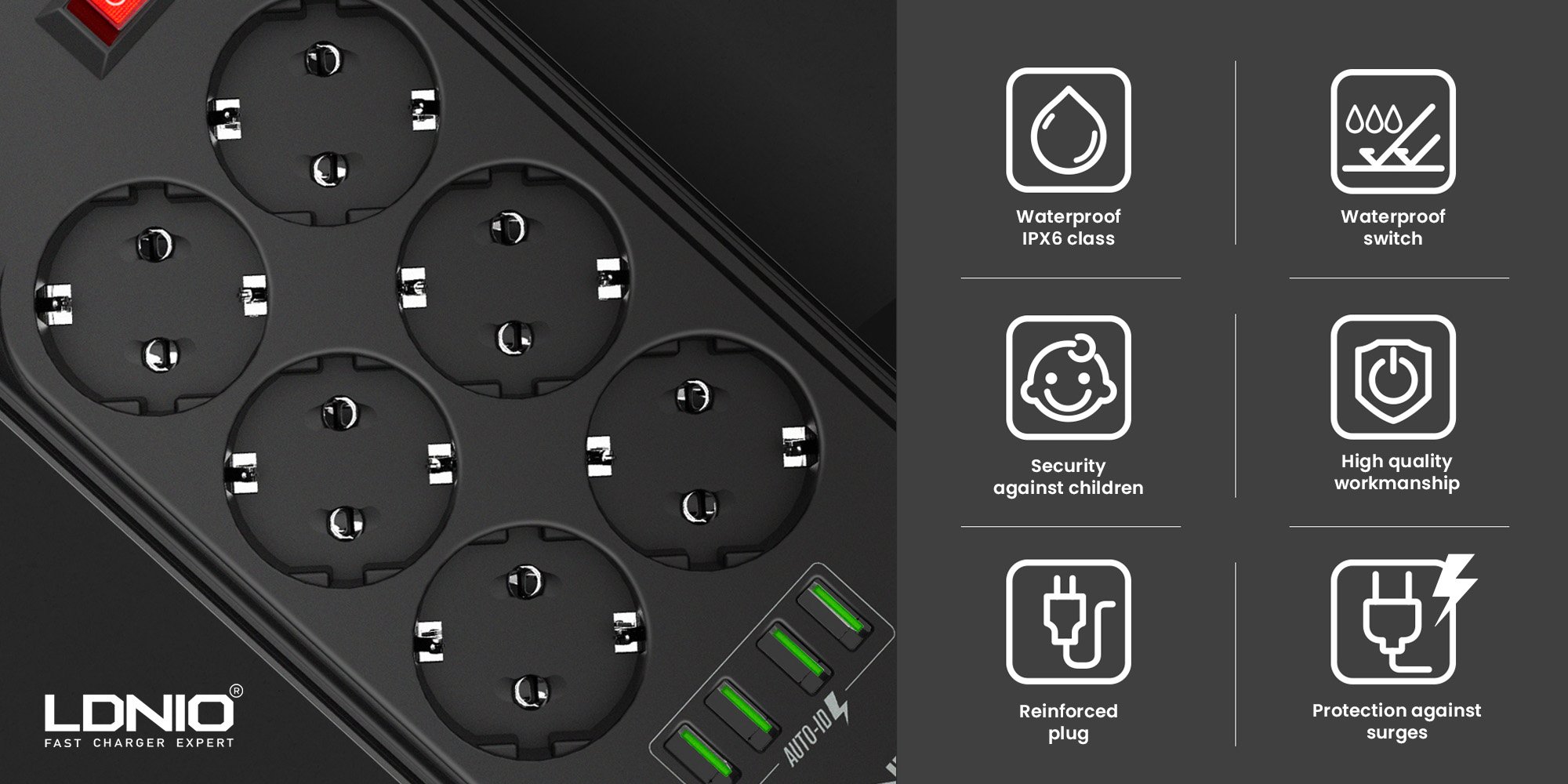 The Ldnio SE6403 is a modern power strip and USB charger in one. With six F-type AC mains sockets and four USB ports, you can power all your everyday electrical devices and charge the batteries in your smartphone, tablet or smartwatch. The power strip can operate between 100 volts and 250 volts, making it perfect for international travel. No matter what you plug into the extension cord, your equipment will be protected by the device’s intelligent systems.