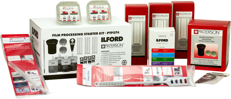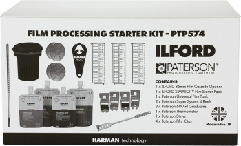 This co-branded ILFORD and Paterson starter kit contains everything* needed to process your first rolls of film. From a developer, stop bath, fixer and wetting agent to the perfect sized developing tank and measuring cylinders for processing two rolls of 35mm film at a time (or one 120 roll).