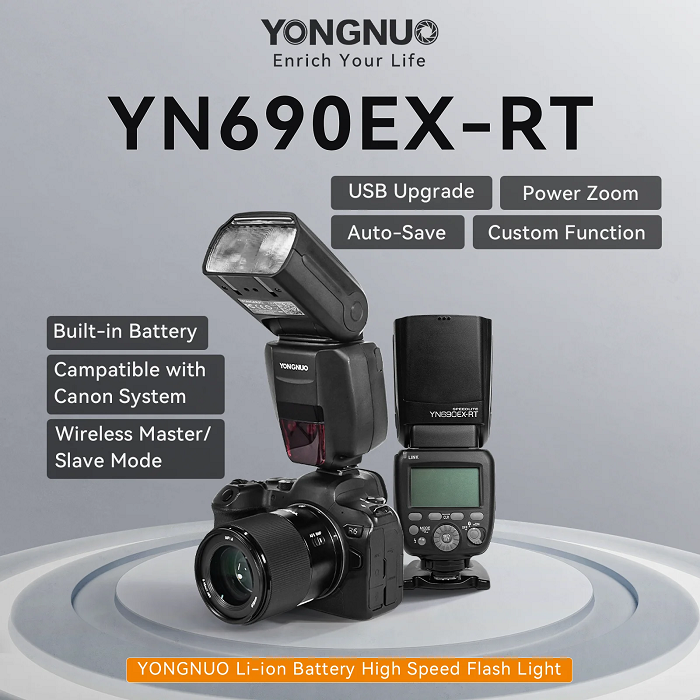 The Yongnuo YN690EX-RT flash impresses not only with its powerful power, but also with its lightning-fast recovery time of just 1 second at full brightness. The fast recharging system of the torch will successfully meet the requirements of professionals who can’t afford long standstills in their work. With this lamp, you can focus on creativity without worrying about the waiting time for the next flash.