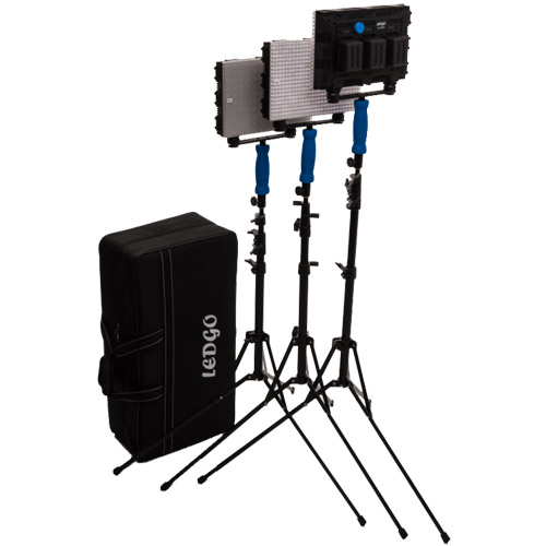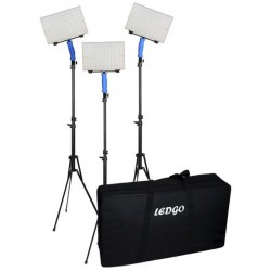 Here is a complete kit containing 3 Ledgo LG-B560 LED lights, 3 light stands, 3 AC-adapters to connect all lamps to AC-power and battery adapters to also allow the use of Panasonic rechargeable camcorder batteries in the CGR-D-series. A practical storage case for the entire equiment is also included.