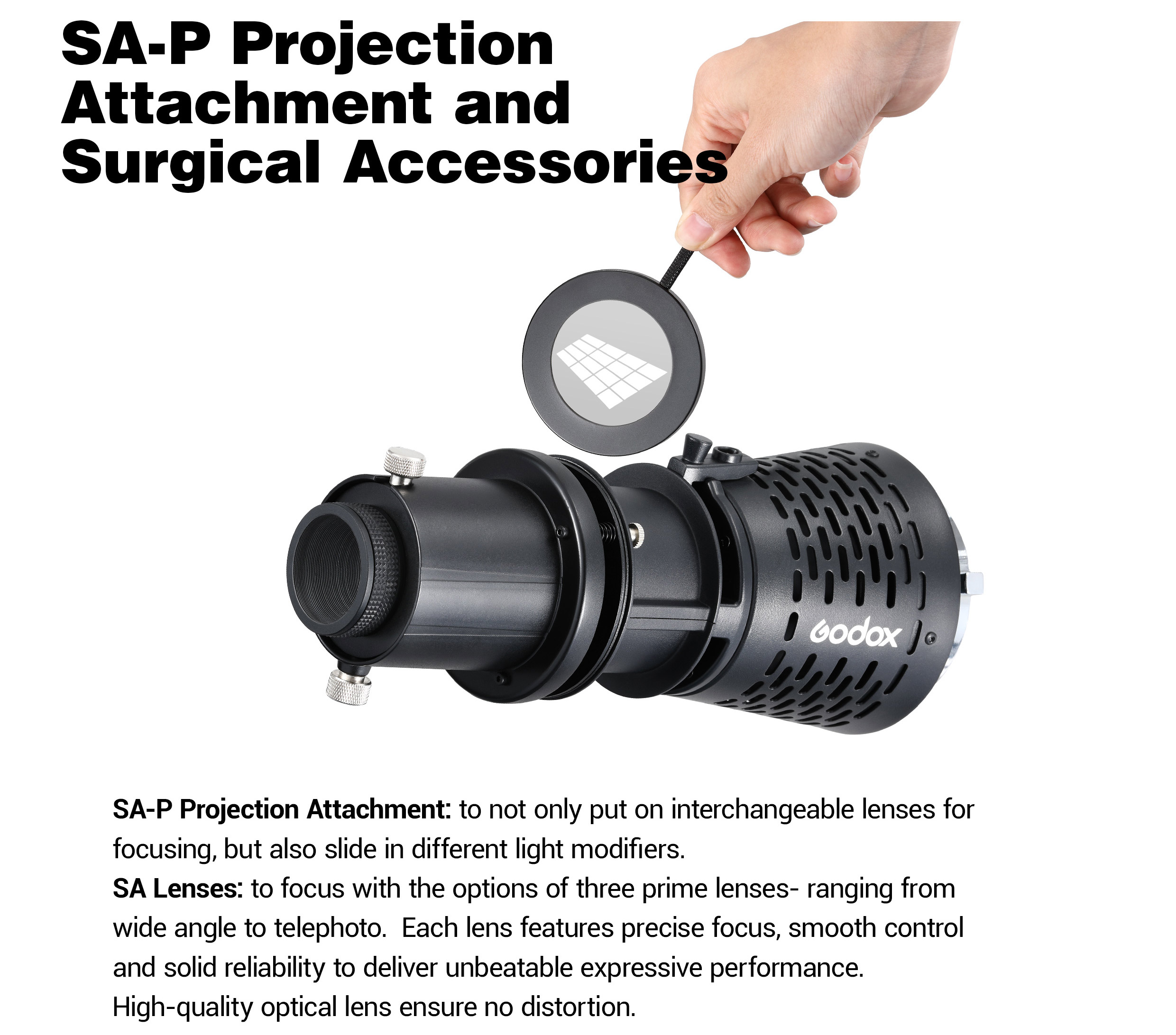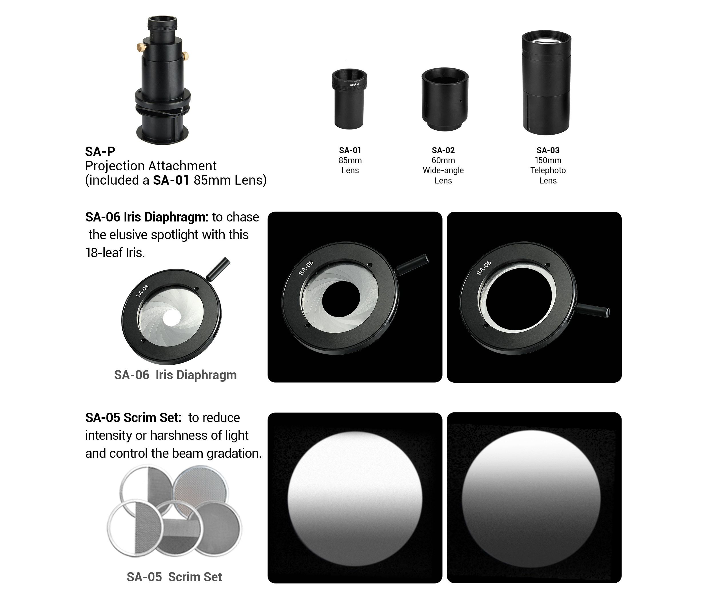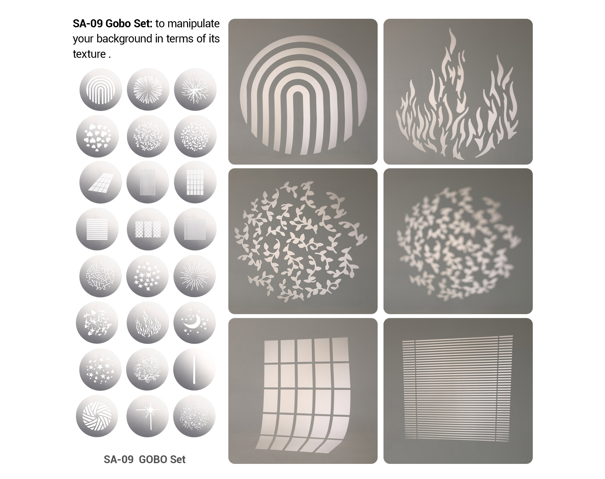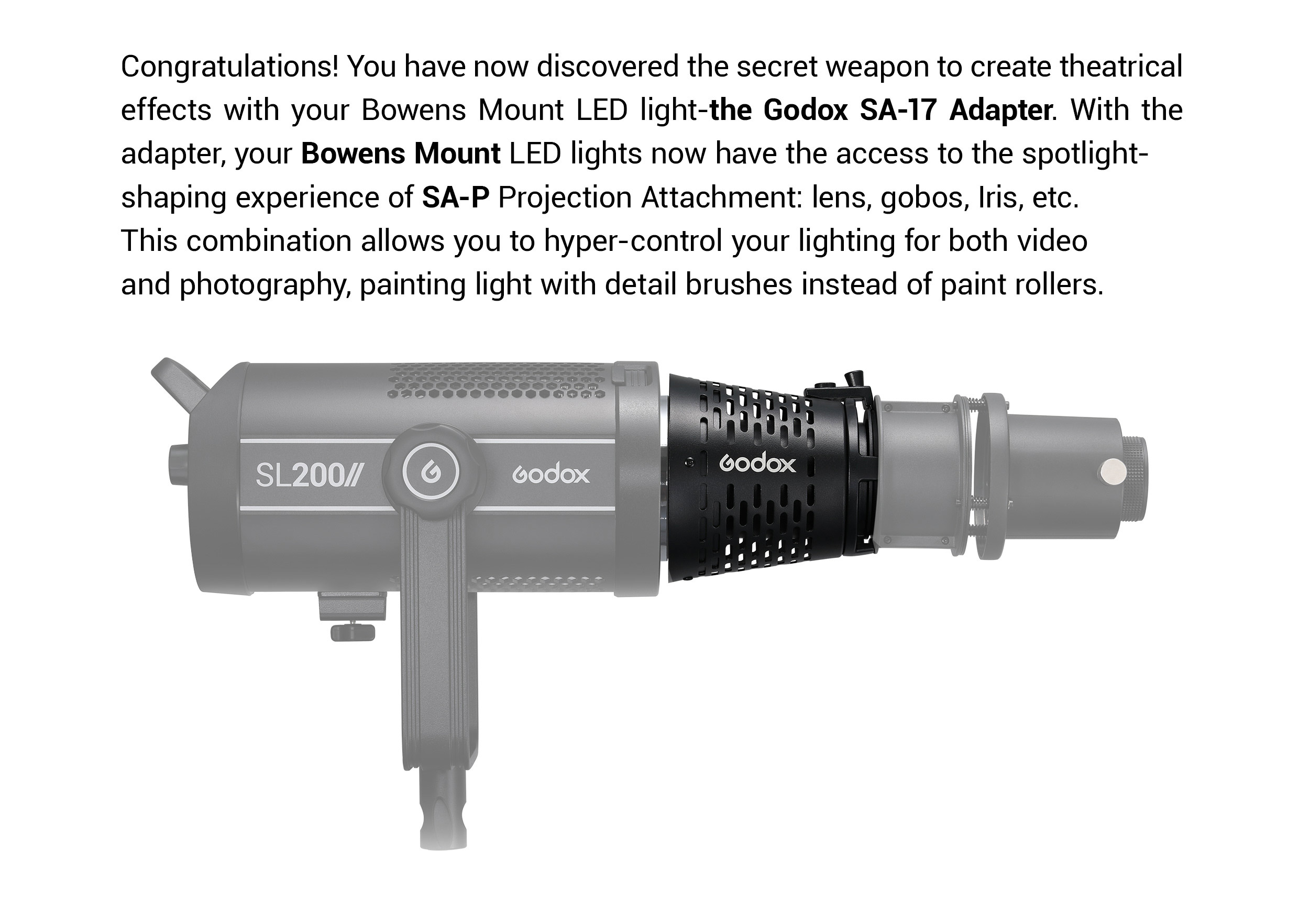 Used on Bowens mount LED Video Light, such as SL, SLII, UL, VL series, enable S30 Projection attachment accessories to be used together to create abundant lighting effect