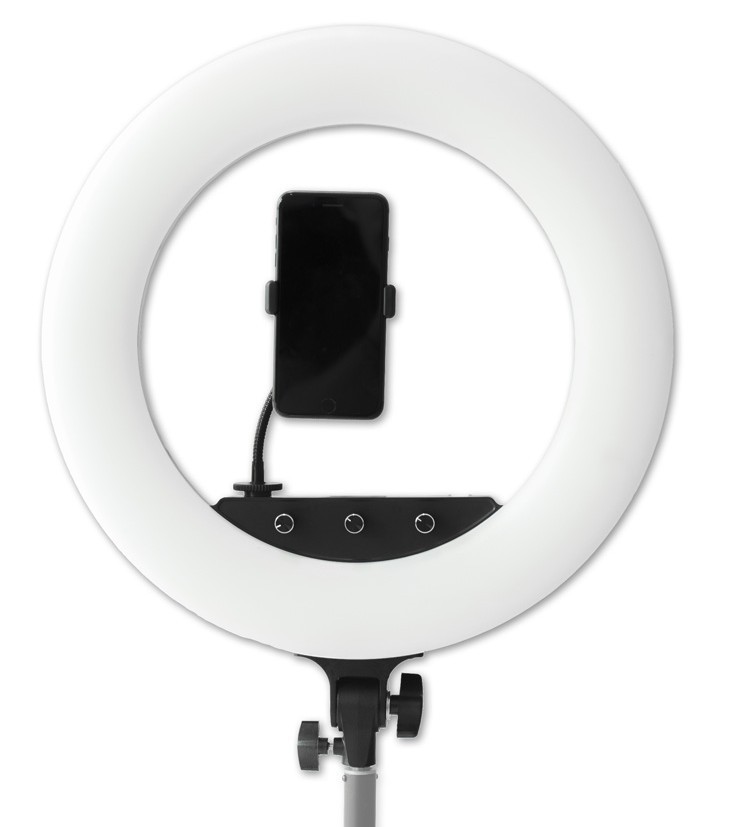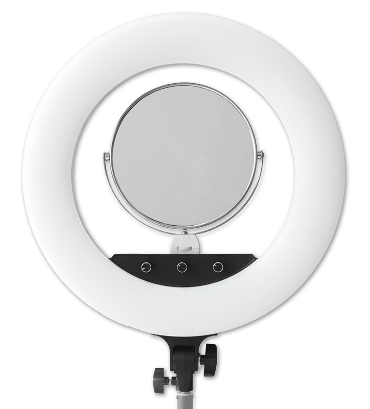 The ring can be powered with its supplied AC power cable or with two batteries type Sony F550 / F750 / F970. The ring has a 1/4" screw thread where you can attach a smartphone holder (included) or other accessories with a 1/4" screw. You can control the light ring remotely with its supplied remote control. A mirror is also included. Everything is packed in a handy bag that allows you to transport or store your light ring safely.