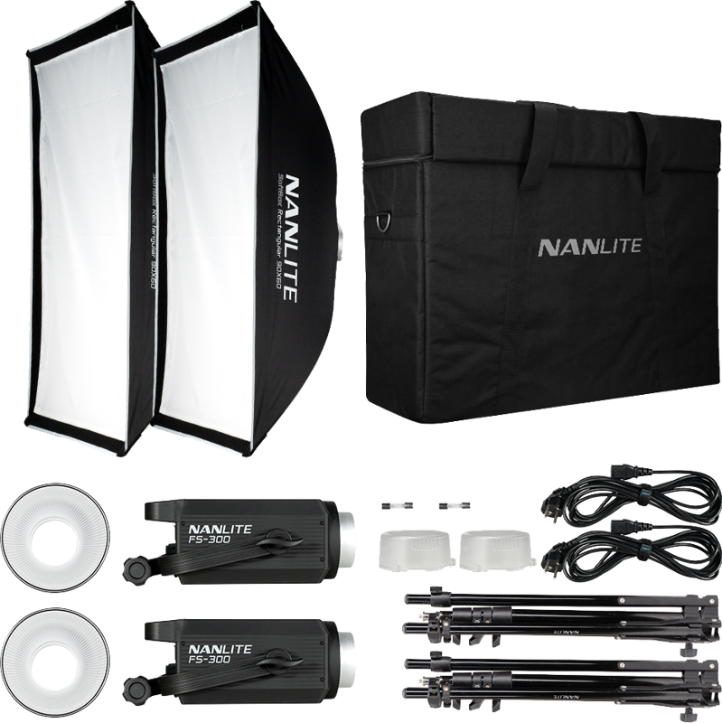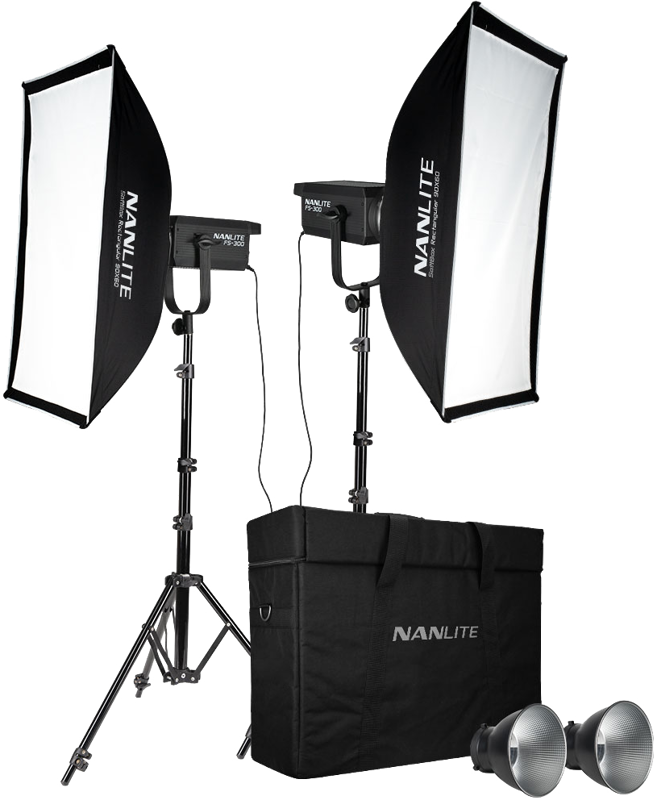 Nanlite FS-300 2-Light studio kit for both video and photgraphers who require studio-quality light. The kit includes two FS-300 LED Monolights, each with a 90x60 Softbox and a 55 degree reflector. 2 light stands – LS 186 and a carrying case.