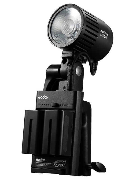 The Godox ML-AK Accessory Kit is assembled with a battery plate for two L-series batteries, a handle, and DC cables.