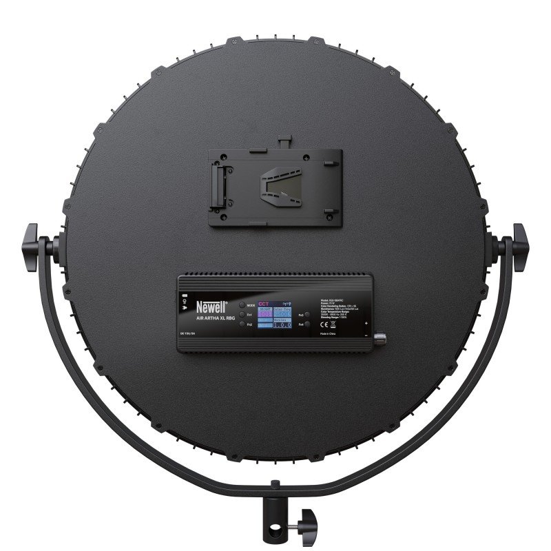 With two different ways to power it, the Newell Air Artha XL RGB RC APP LED lamp will work well anywhere – in the studio, at home, or in the field. You will find a compatible DC 15 V / 5 A power supply included. The unit also features a V-Mount (V-Lock) battery socket. This allows you to enjoy wireless power wherever access to an electrical outlet is limited.