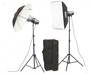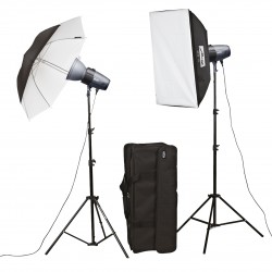 The BL-200 SB / UM kit II contains 2 mecastudio BL-200 studio flash units incl. flex and sync cable, protective caps, 2 air-cushioned lighting tripods LS- 200, each 200 cm tall, 1 standard reflector SR-18, 1 black/white umbrella UM-80 BW, 84 cm, and 1 carry case B-80 for 2 studio flash units with accessories.