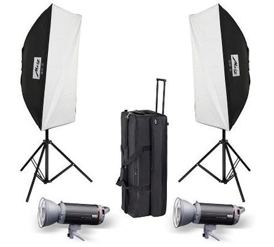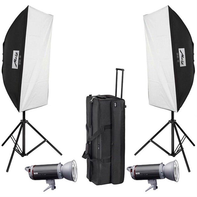 The mecastudio Top Line kit TL-600 SB kit II contains two mecastudio TL-600 studio flash units incl. flex and sync cable, protective caps, 2 air-cushioned lighting tripods, each 247 cm tall, 2 soft boxes SB 60-90 and a transport case T-75. The mecastudio Top Line kit TL- 300 SB kit II contains mecastudio TL-300 studio flash units instead.