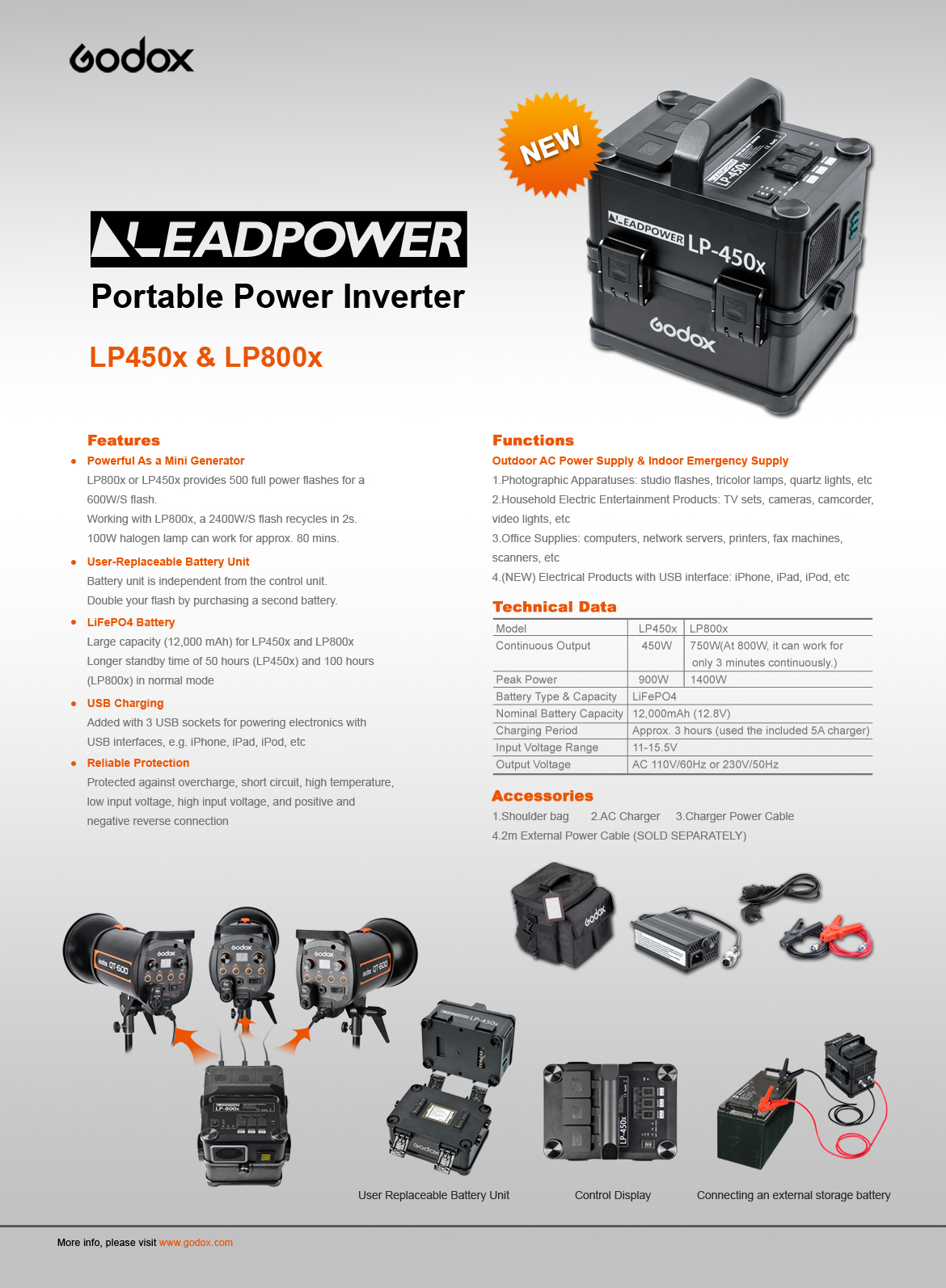 The Godox LP800X Portable Power Inverter is a portable battery pack specially designed for use with studio strobes. The LP800X is carried out with 220V outlets 3x for a maximum continuous load of 800W and a peak load of 1400W. There may be three flash units connected. Moreover Godox LP800X is protected against overheating, over voltage, an undervoltage and an excessive burden.
