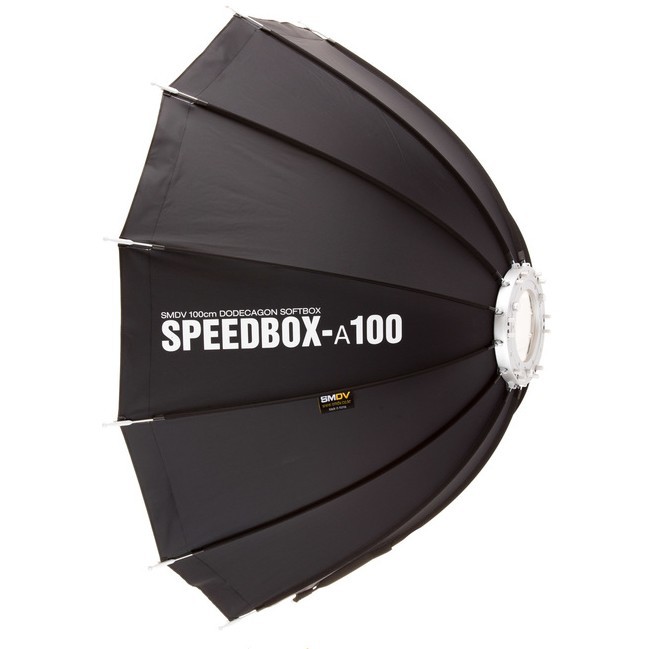 The  SMDV Alpha Speedbox-A100  is a 12-sided softbox with a diameter of 100 centimeters designed for use with modeling lamps with a power of 300 watts. The softbox is fast an easy to set up thanks to the patented quick-release speed ring. All you have to do is to fold the rods out. The softbox is just as quickly to fold by unlocking the rods with the pegs on the back of the speed ring. By using the softbox light from the flash will soften so you obtain a better exposure of the subject.