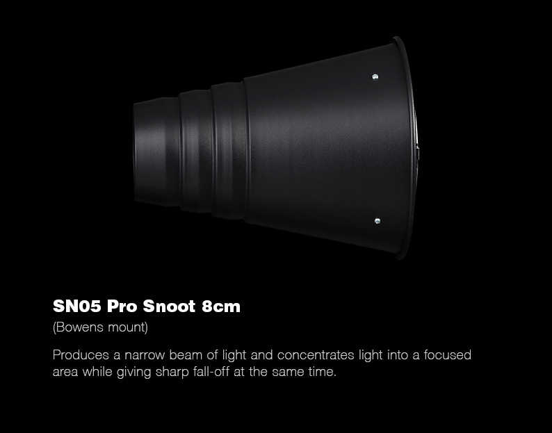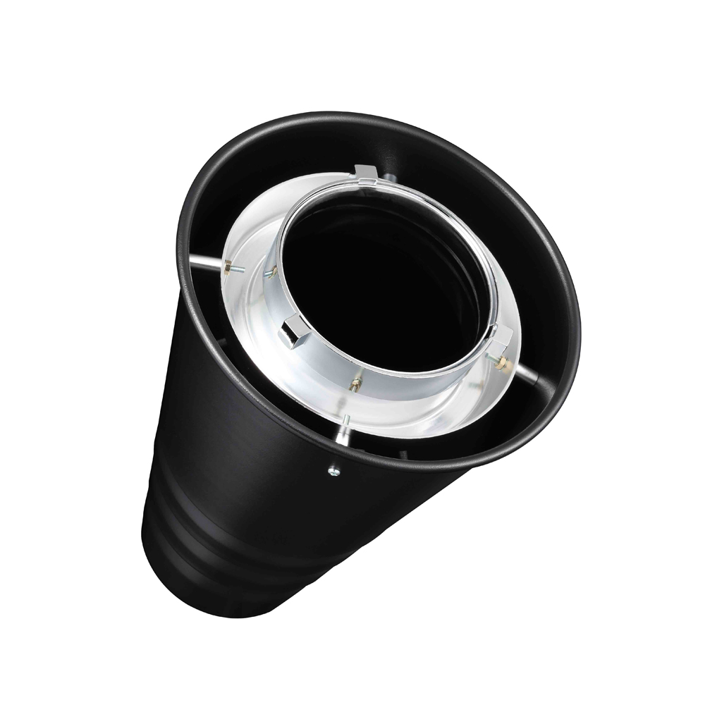 The Godox Pro Snoot is designed for both Godox monolights and flash heads with Bowens mount from other manufacturers. The snoot has a diameter of 8 centimeter for a narrow and focused beam.