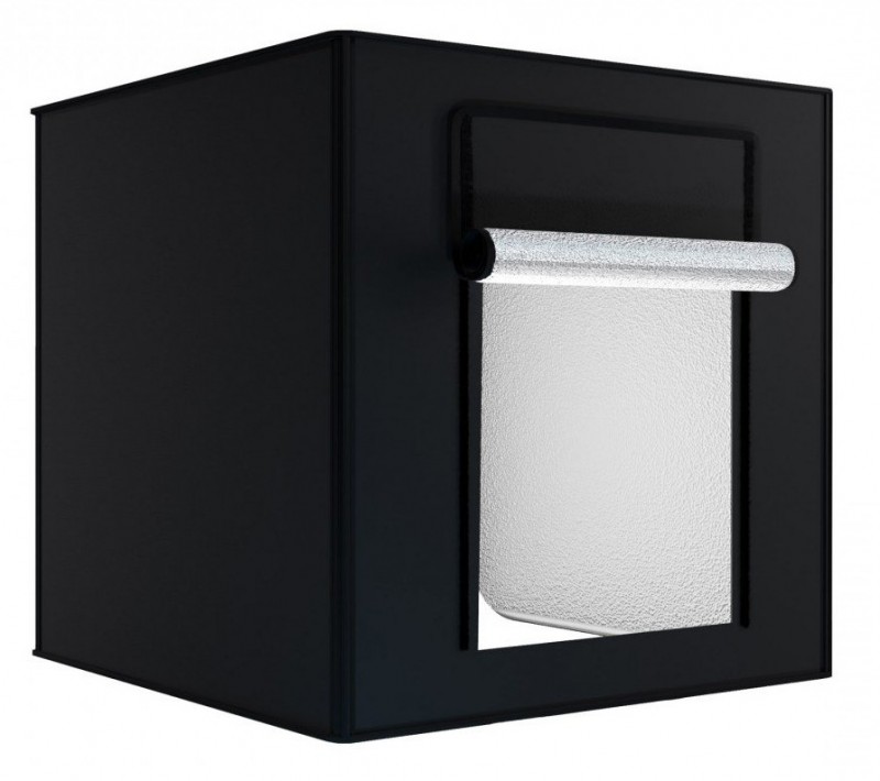 The tent has been equipped with two LED panels, the position of which can be adjusted in order to achieve various lighting setups. Its interior is covered with a special material that evenly distributes the light generated by the lamps. An additional diffuser allows for a diffused, soft lighting effect, while reducing glare, reflections and shadows on the photographed product.