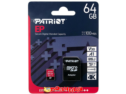 Карта памяти microSD»PATRIOT»Patriot microSD card 64 Gb. R90/W80 MB/s V30 UHS-I U3 + SD adapter»(new)
