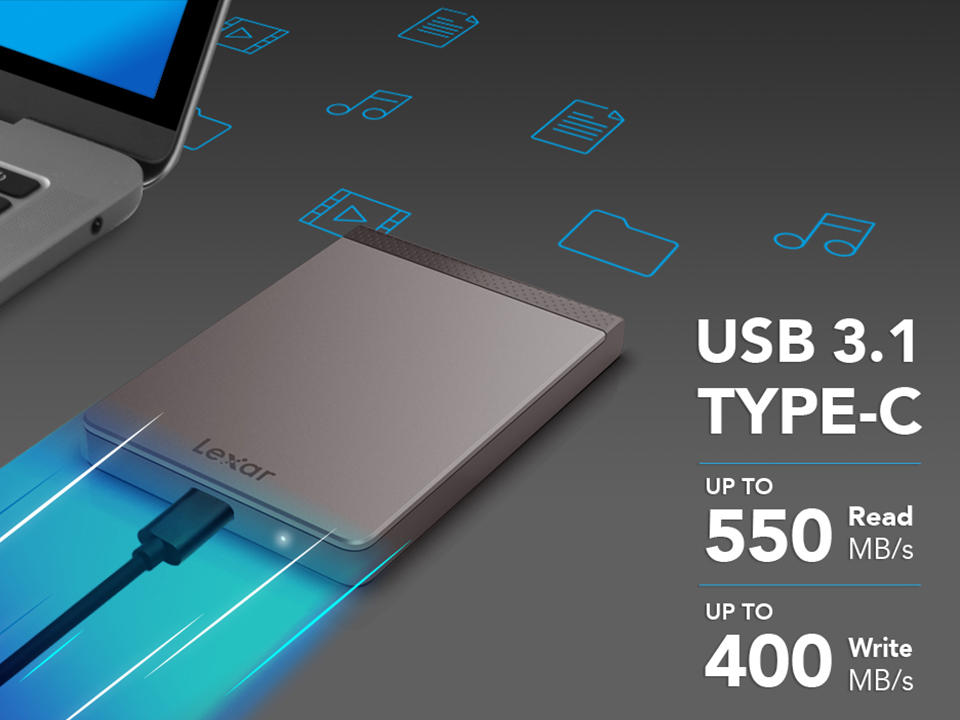 Store and access your data anywhere. Take your data on-the-go with the SL200 Portable SSD from Lexar. This sleek and slim drive features a premium finish and is available in 512GB, 1TB and 2TB of storage space. To keep your data secure, it's drop-, shock-, vibration-resistant and comes with an advanced security solution with 256-bit AES encryption. Performance-wise, it has transfer speeds of up to 550 MB/s and a write speed of up to 400 MB/s1. Connect it to your system using the included USB Type-C to USB Type-C or USB Type-C to Type-A cable, and it's ready to use.