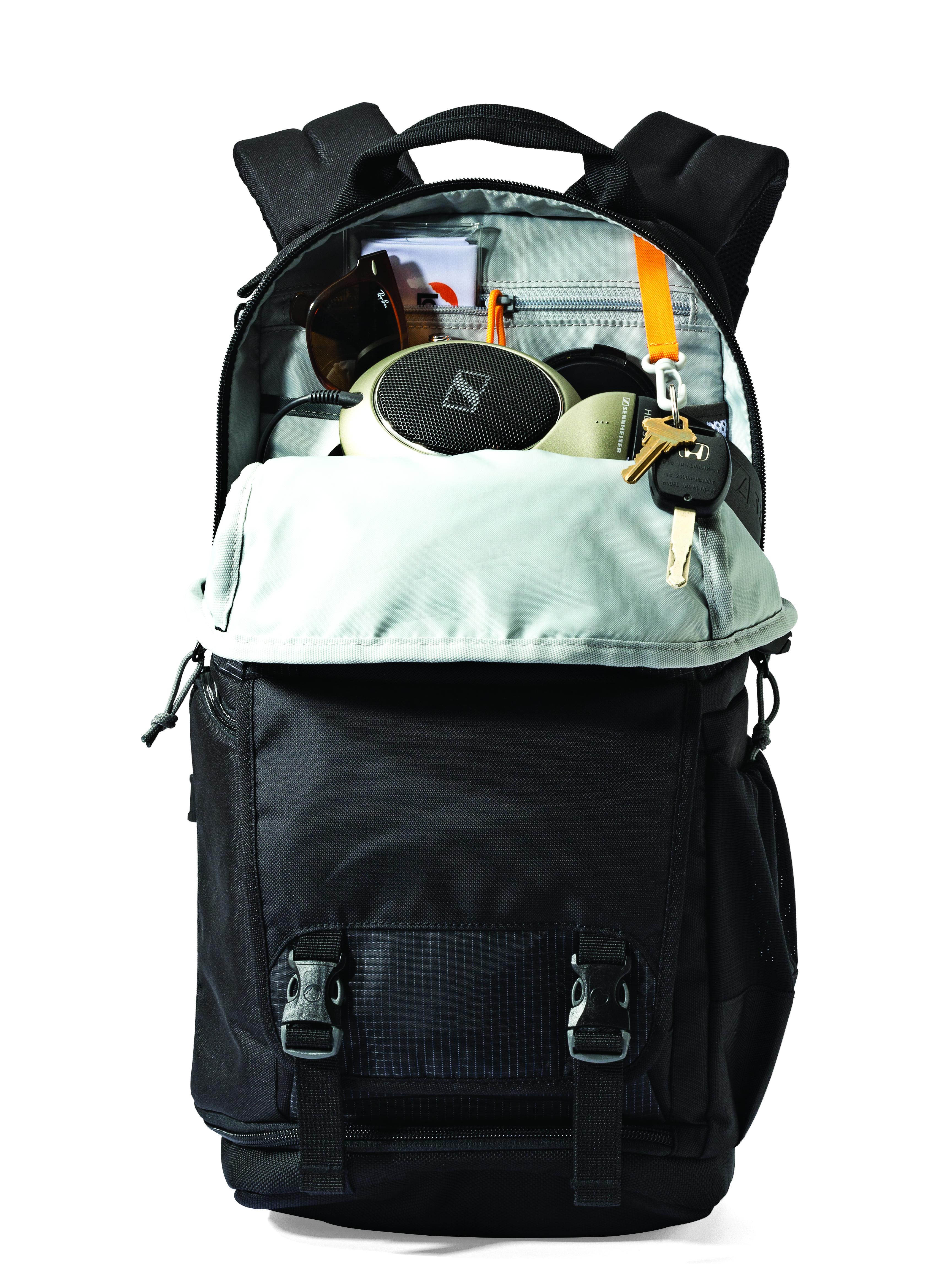 - Stash quick-grab items such as headphones, portable hard drive, smartphones, etc. in the open zone.