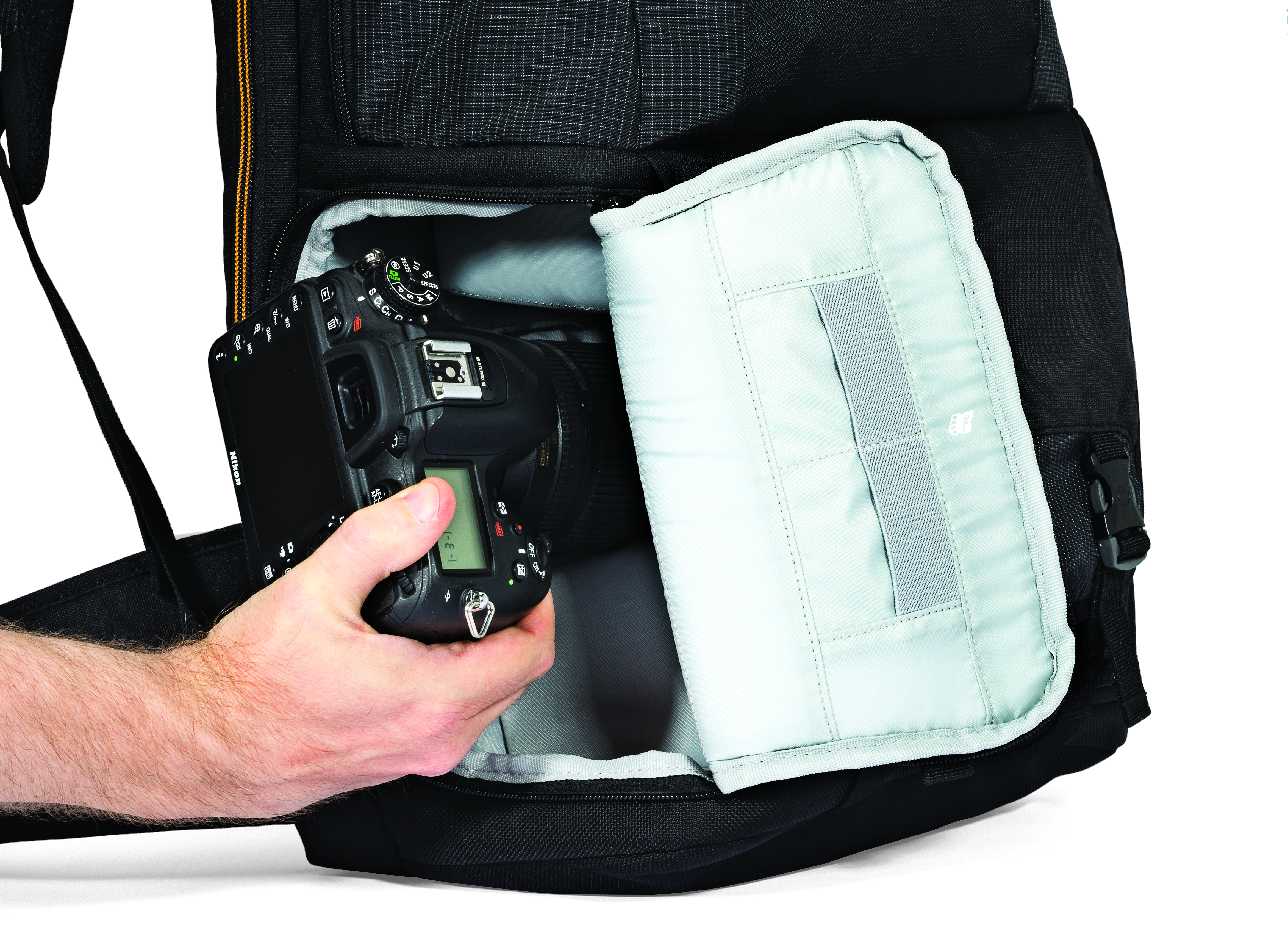 - Easily access and pack gear via the camera zone. It features a customizable interior and two access modes: quick-reach side entry and full-access gear compartment.