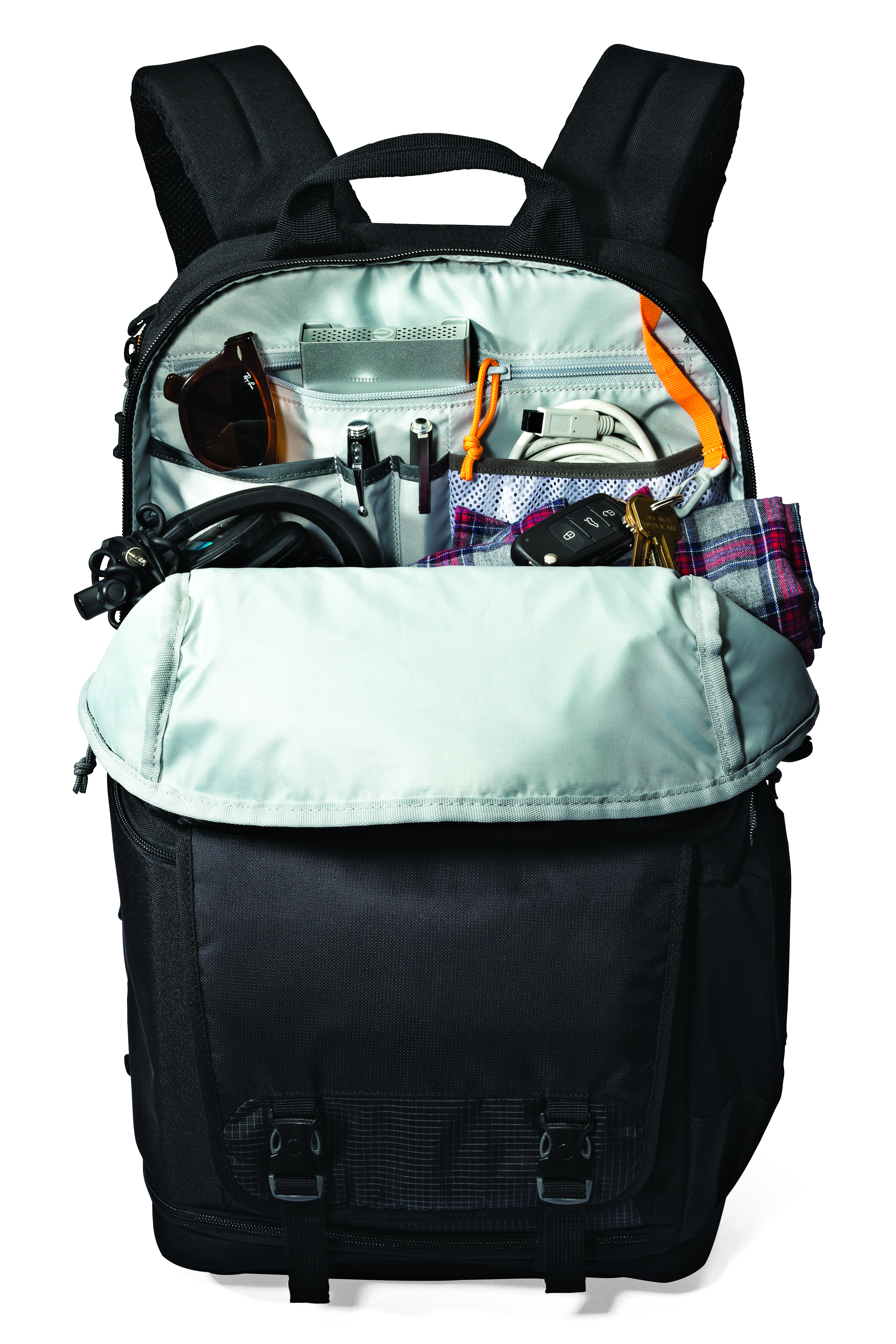 - Stash quick-grab items such as headphones, portable hard drive, smartphones, etc. in the open zone.