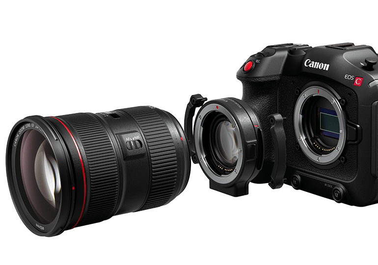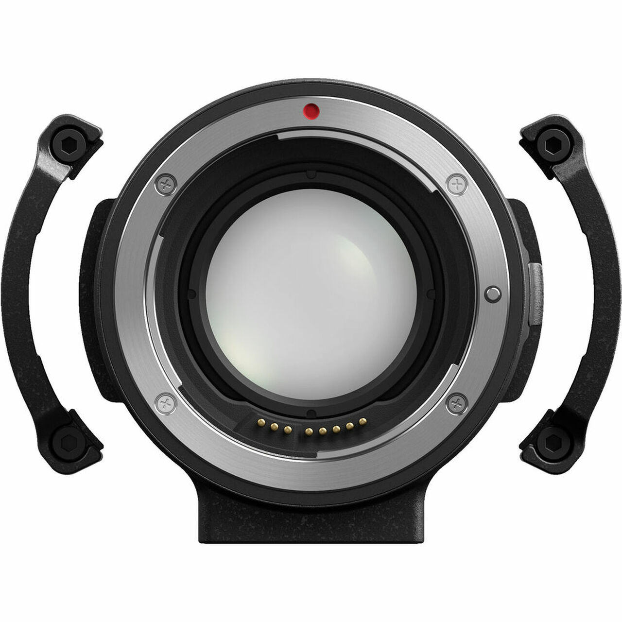 Extending the range of compatible lenses while maintaining their original field of view, the Canon Mount Adapter EF-EOS R 0.71x permits attaching EF-mount lenses to RF-mount cine and mirrorless cameras. Intended for cameras featuring a Super 35 sensor size, this adapter also incorporates an optical system to increase the effective angle of view by 0.71x, reducing the effects of a full-frame to Super 35 crop factor and increasing the maximum aperture performance by one stop. Electric contacts are also incorporated into the adapter's design and maintain full communication between the camera and lens, as well as support metadata transmission and use of Dual Pixel AF with select Canon EF lenses. Also, the adapter has been specifically designed for the EOS C70 cinema camera and features four screws and a split locking collar to ensure a secure attachment.