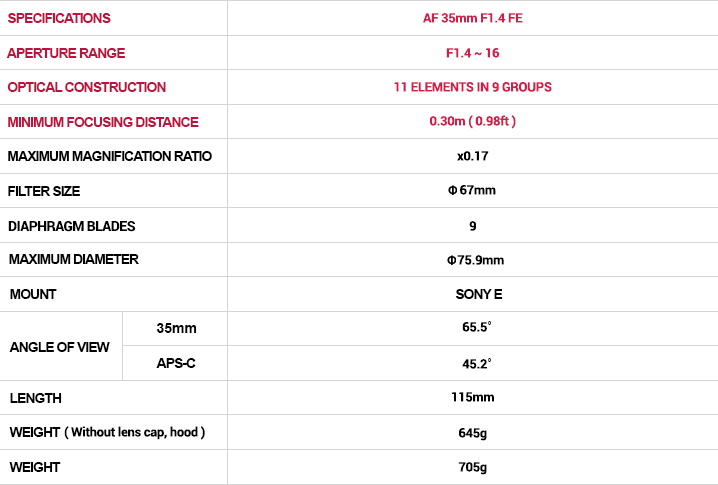 This new AF 35mm F1.4 FE works in harmony with full frame mirrorless cameras in Sony E mount such as Sony α7 or α9 series. It is designed to appeal to enthusiasts and professionals who are ready to take the next step up in photography. It is the excellent companion to create artworks from everyday moments.